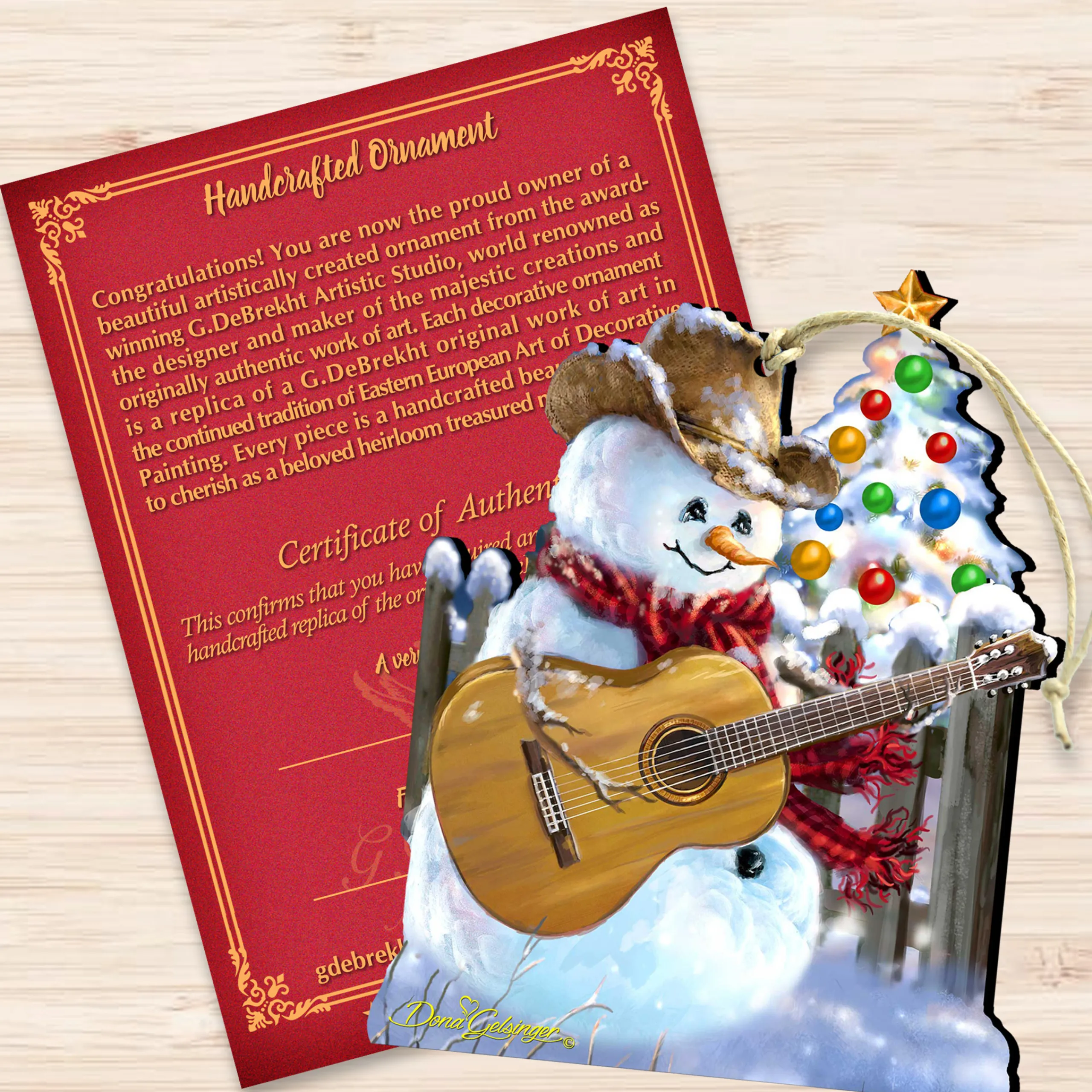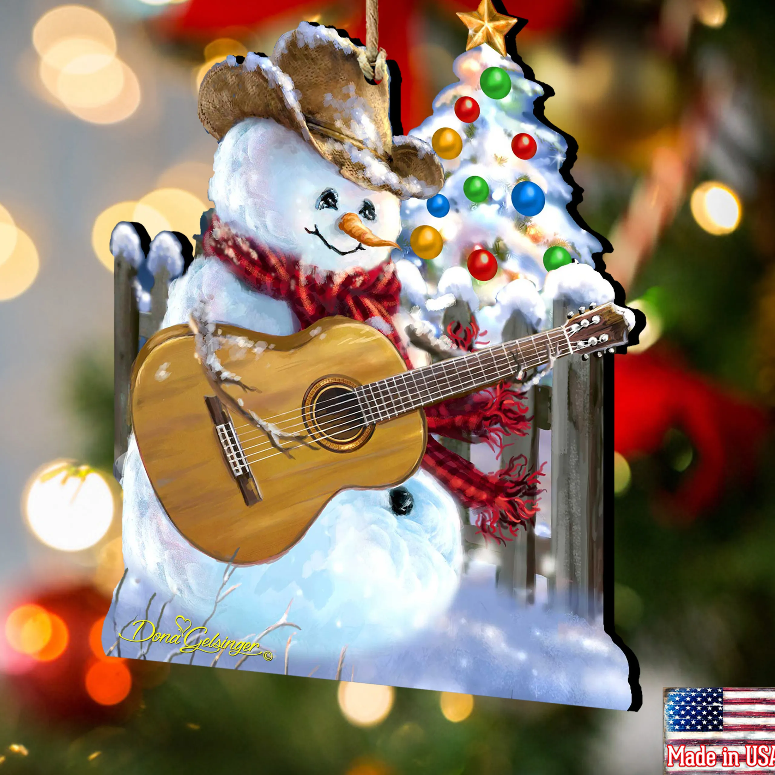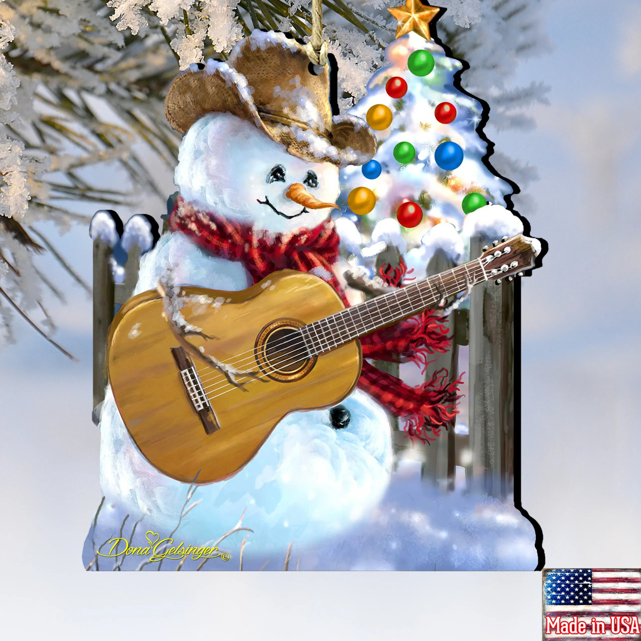 Invite The Beauty Of Christmas Into Your Home With This Set Of Charming Ornaments. These Ornaments Depict A Snowman Playing The Guitar With A Christmas Tree At The Back. Each Ornament Was Handcrafted From Birch Wood And Designed By Dona Gelsinger. These Would Be A Perfect Addition To Your Home Christmas Decoration Or A Great Gift.
