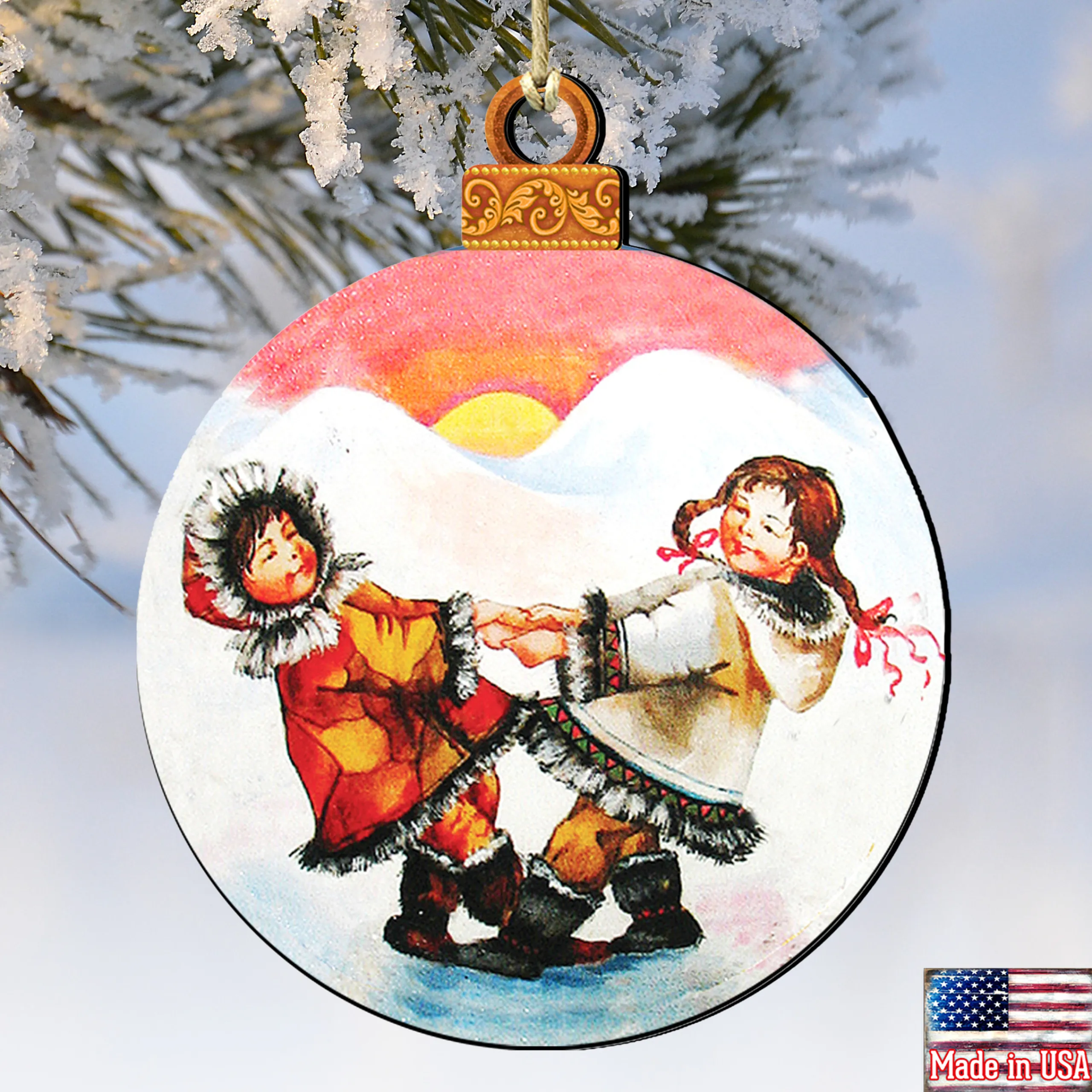 Invite The Beauty Of Christmas Into Your Home With This Set Of Charming Ornaments. These Ornaments Depict Two Girls Holding Their Hands Together In A Frosty Place. Each Ornament Was Handcrafted From Birch Wood And Designed By G.Debrekht. These Would Be A Perfect Addition To Your Home Christmas Decoration Or A Great Gift.