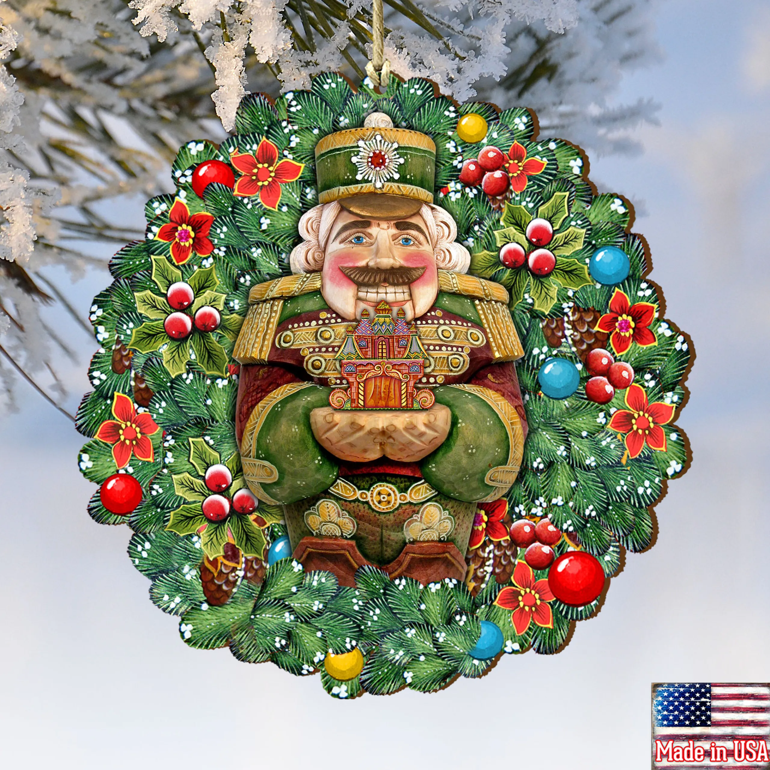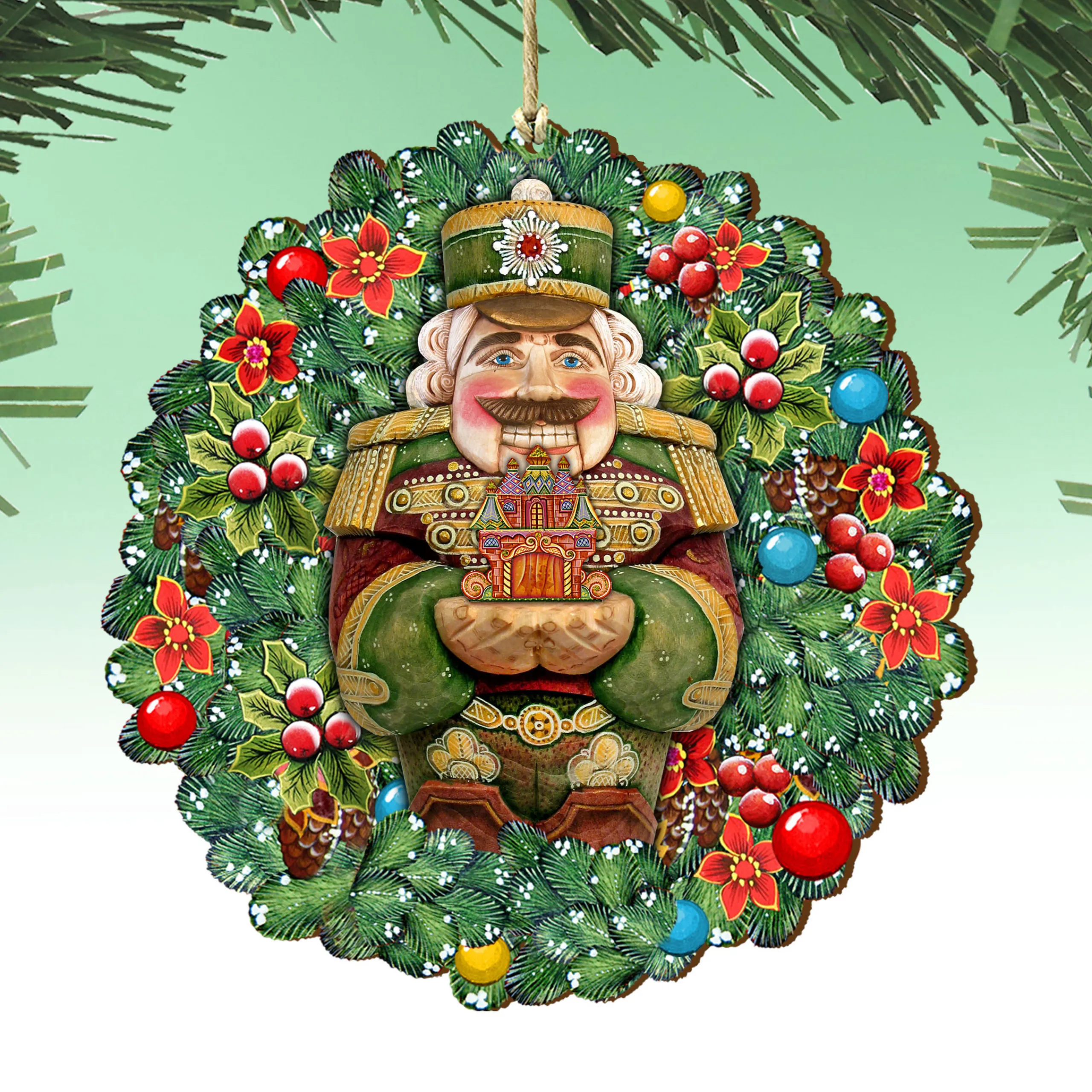 Invite The Beauty Of Christmas Into Your Home With This Set Of Charming Ornaments. These Ornaments Depict A Wreath With A Nutcracker Holding A Gift Surrounded By Flowers And Christmas Balls. Each Ornament Was Handcrafted From Birch Wood And Designed By G.Debrekht. These Would Be A Perfect Addition To Your Home Christmas Decoration Or A Great Gift.