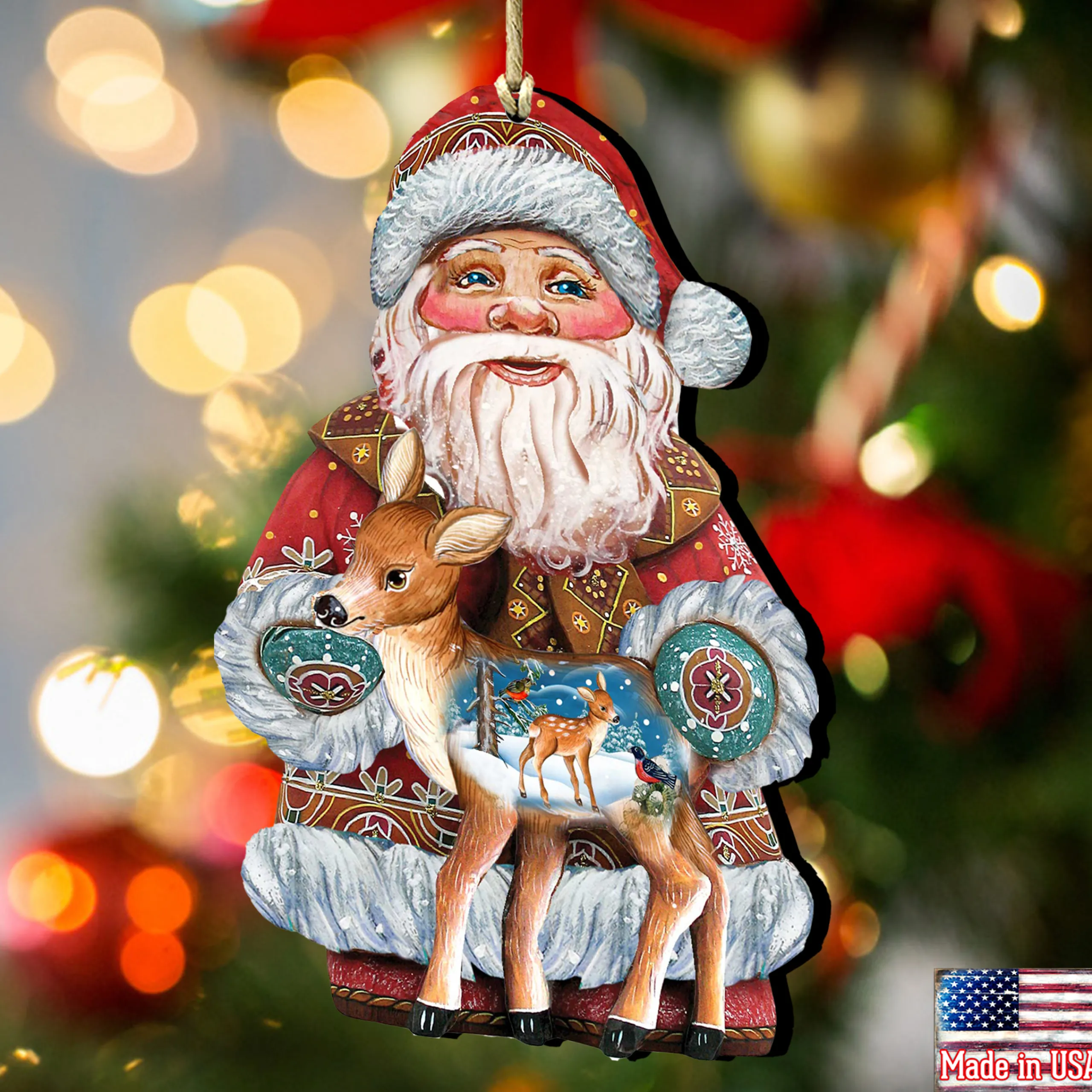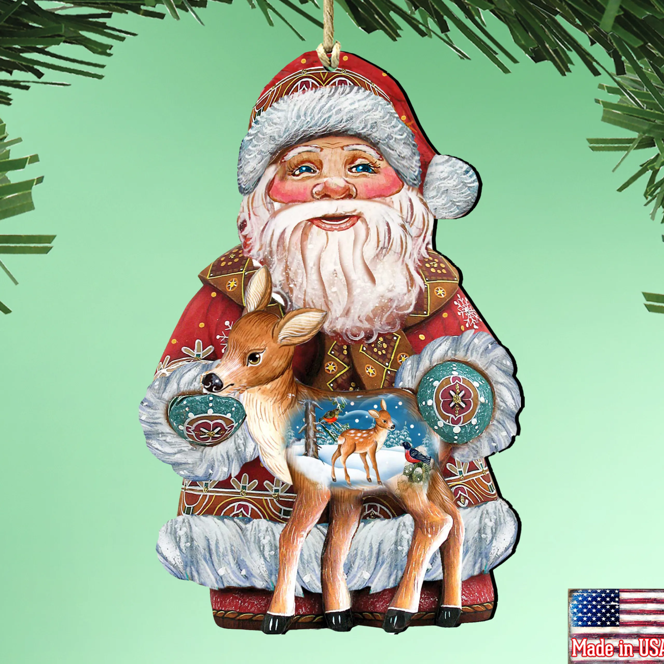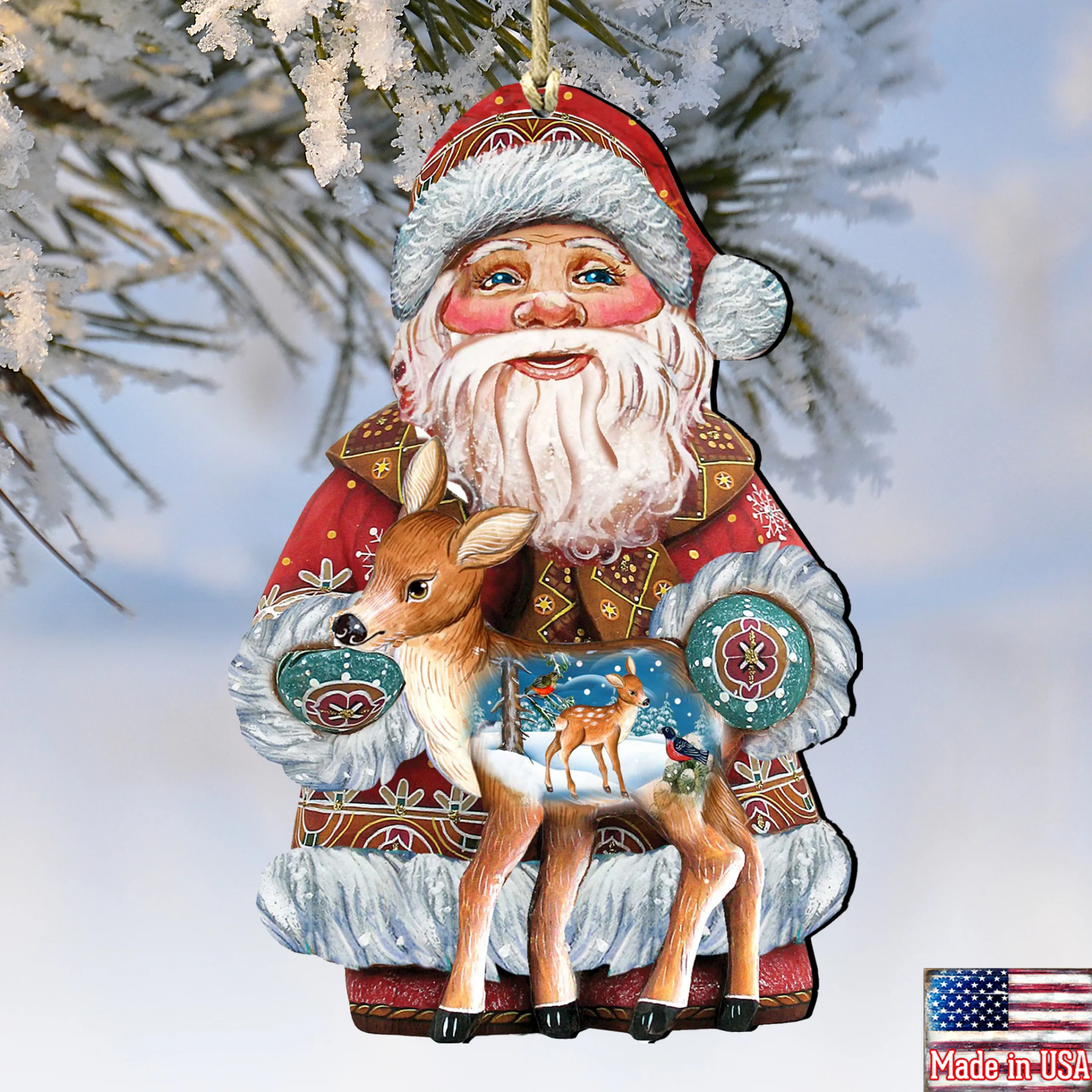 Ornaments Depict Santa Claus Holding A Fawn With Birds And Another Fawn Image On It