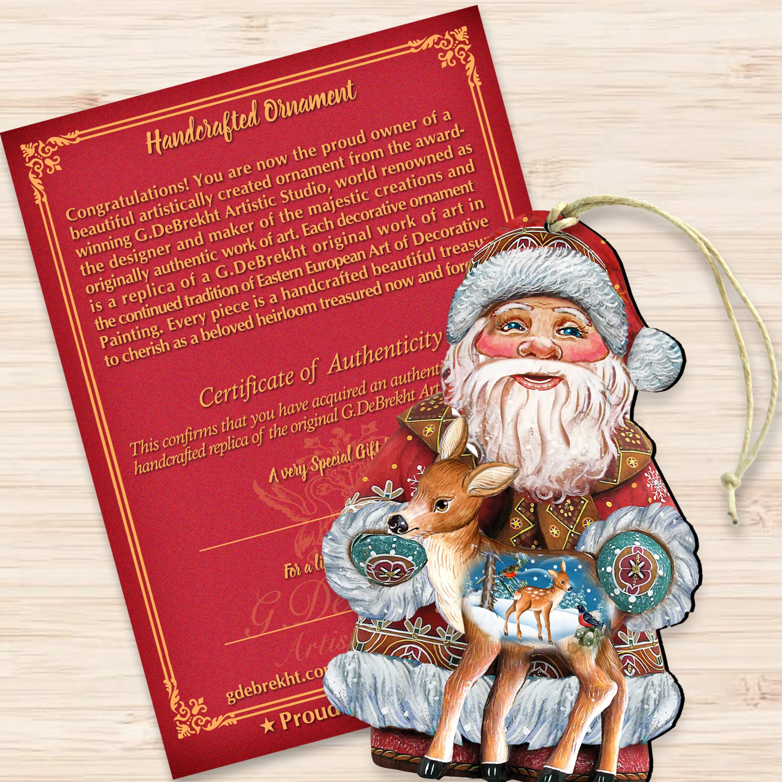 Invite The Beauty Of Christmas Into Your Home With This Set Of Charming Ornaments. These Ornaments Depict Santa Claus Holding A Fawn With Birds And Another Fawn Image On It. Each Ornament Was Handcrafted From Birch Wood And Designed By G.Debrekht. These Would Be A Perfect Addition To Your Home Christmas Decoration Or A Great Gift.