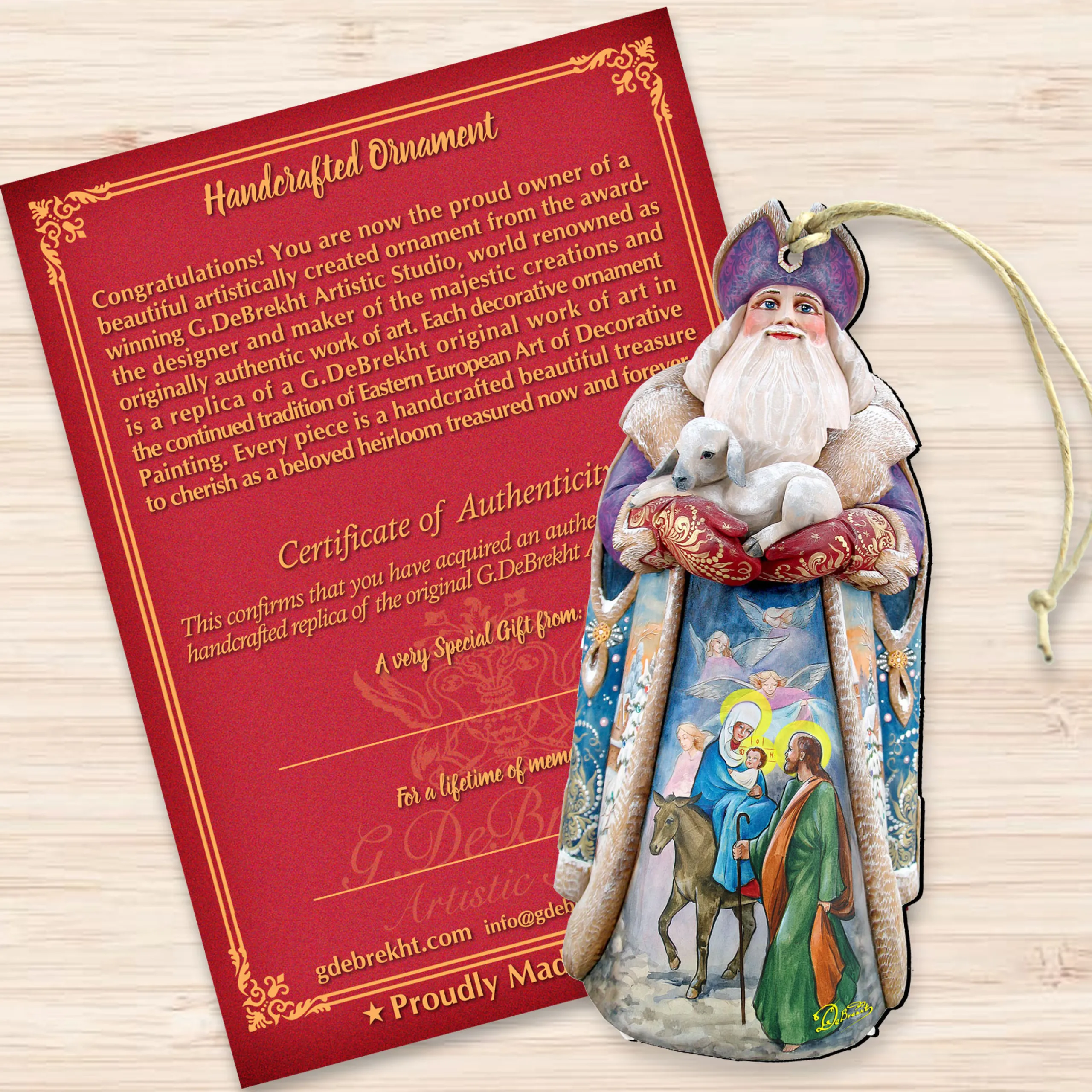 Invite The Beauty Of Christmas Into Your Home With This Set Of Charming Ornaments. These Ornaments Depict Santa Claus Carrying A Goat With The Guardian Angels And A Mother Carrying Her Child While Riding A Horse. Each Ornament Was Handcrafted From Birch Wood And Designed By G.Debrekht. These Would Be A Perfect Addition To Your Home Christmas Decoration Or A Great Gift.