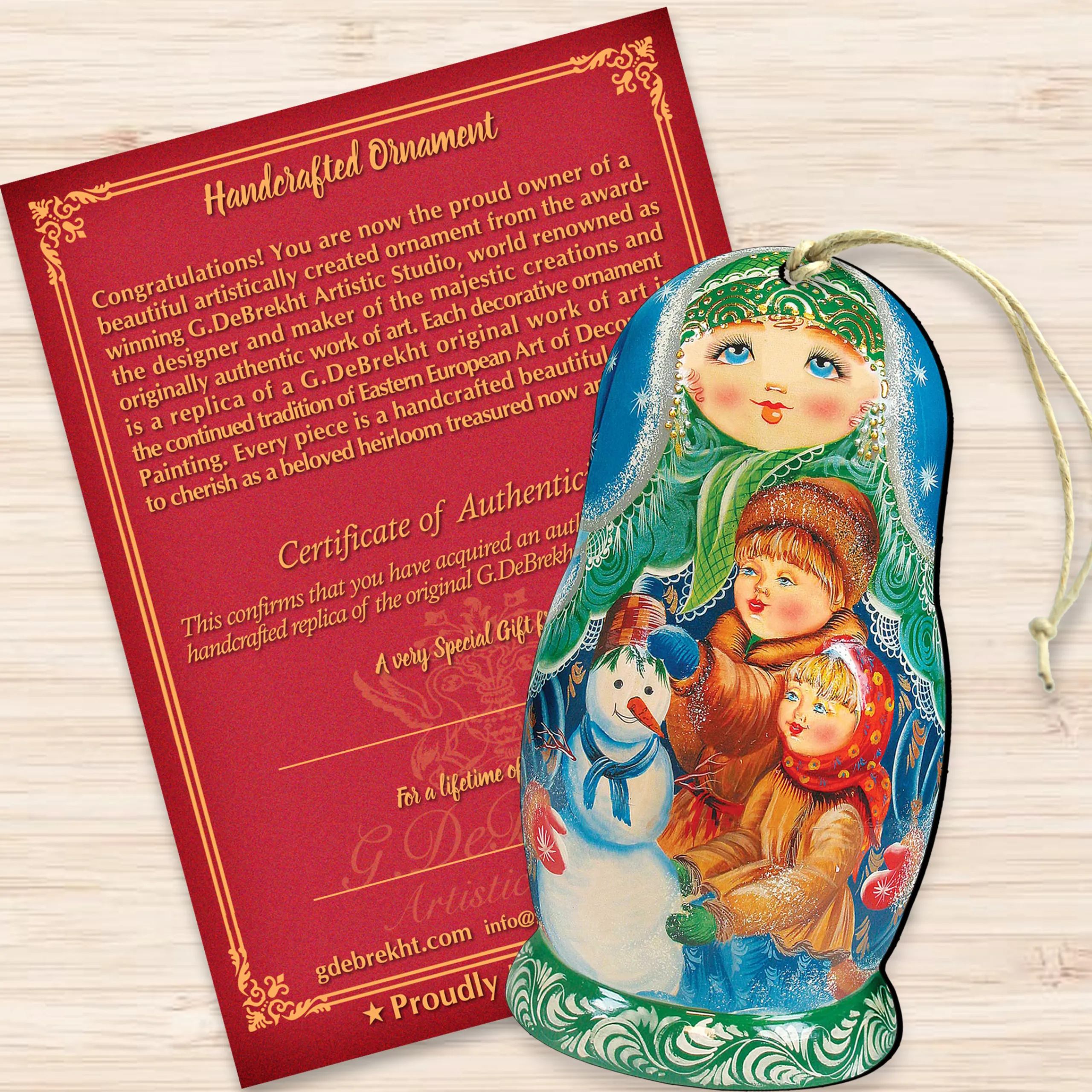 Invite The Beauty Of Christmas Into Your Home With This Set Of Charming Ornaments. These Ornaments Depict Matreshka Dolls Playing With A Snowman. Each Ornament Was Handcrafted From Birch Wood And Designed By G.Debrekht. These Would Be A Perfect Addition To Your Home Christmas Decoration Or A Great Gift.