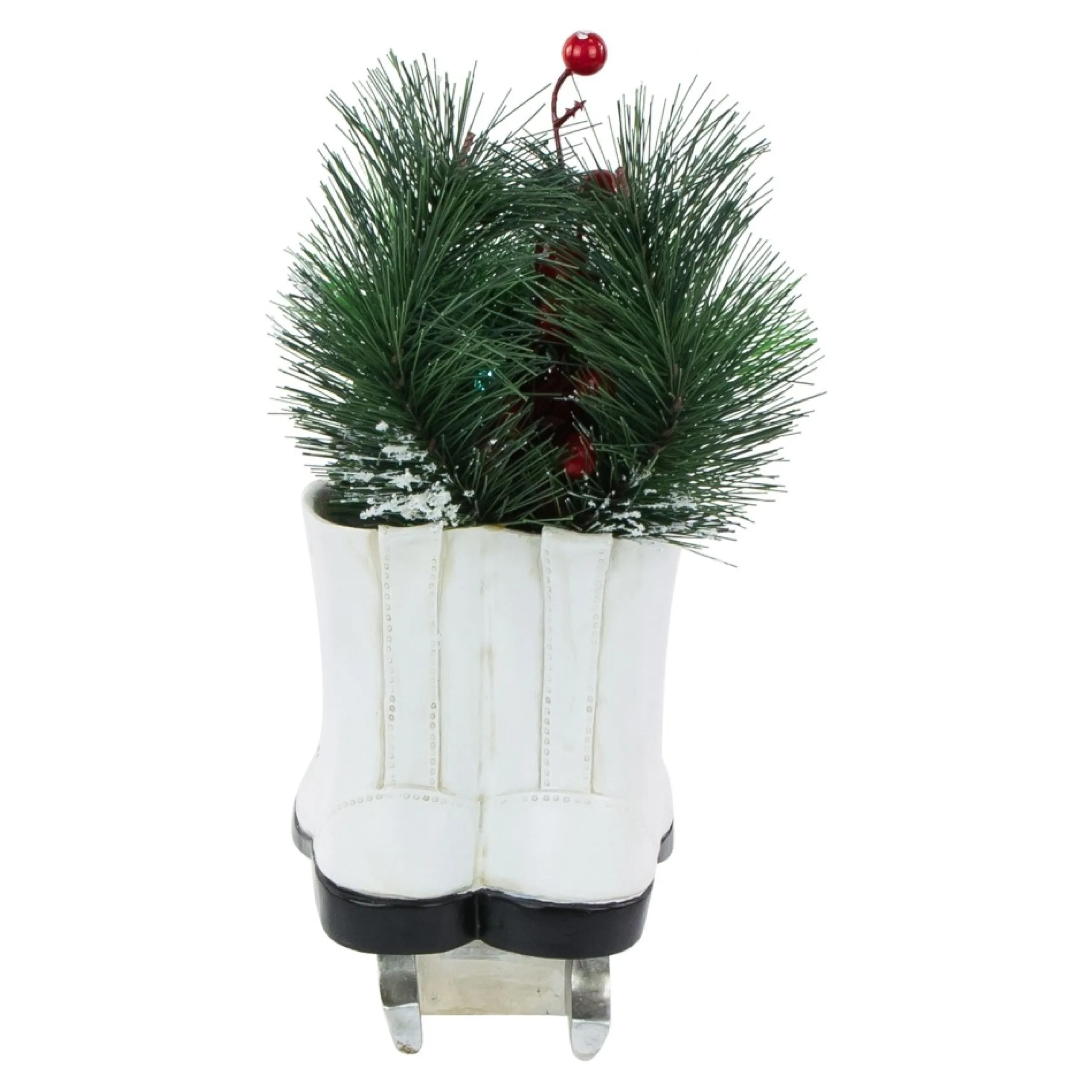 Welcome The Winter Season With This Festive Floral Arrangement That Will Add A Touch Of Nature To Your Holiday Season. Silver Skate Blades Prop Up White Laced Boots That Contain A Spray Of Artificial Evergreen Tips Trimmed With Red Berries And Pinecones. This Unique Centerpiece Can Be Displayed On Tabletops, Shelves, And Mantles Or Anywhere You Wish To Add A Little Bit Of Flair.