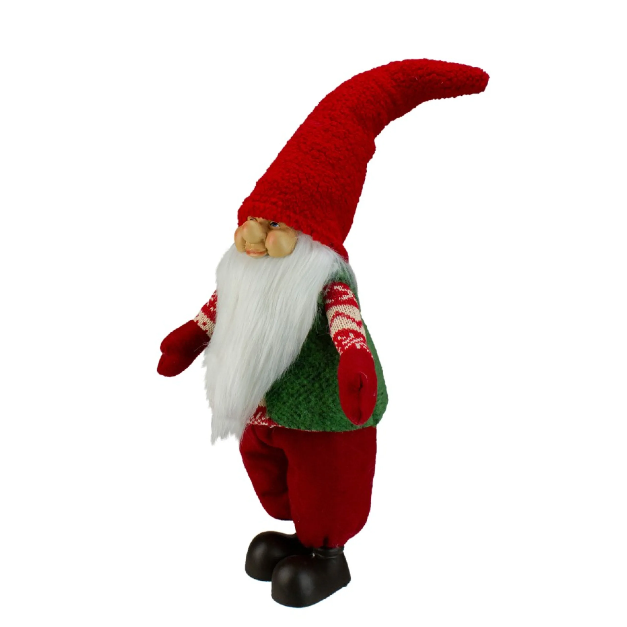 Gnome Is Wearing A Christmas Colored Patterned Sweater With A Green Vest
