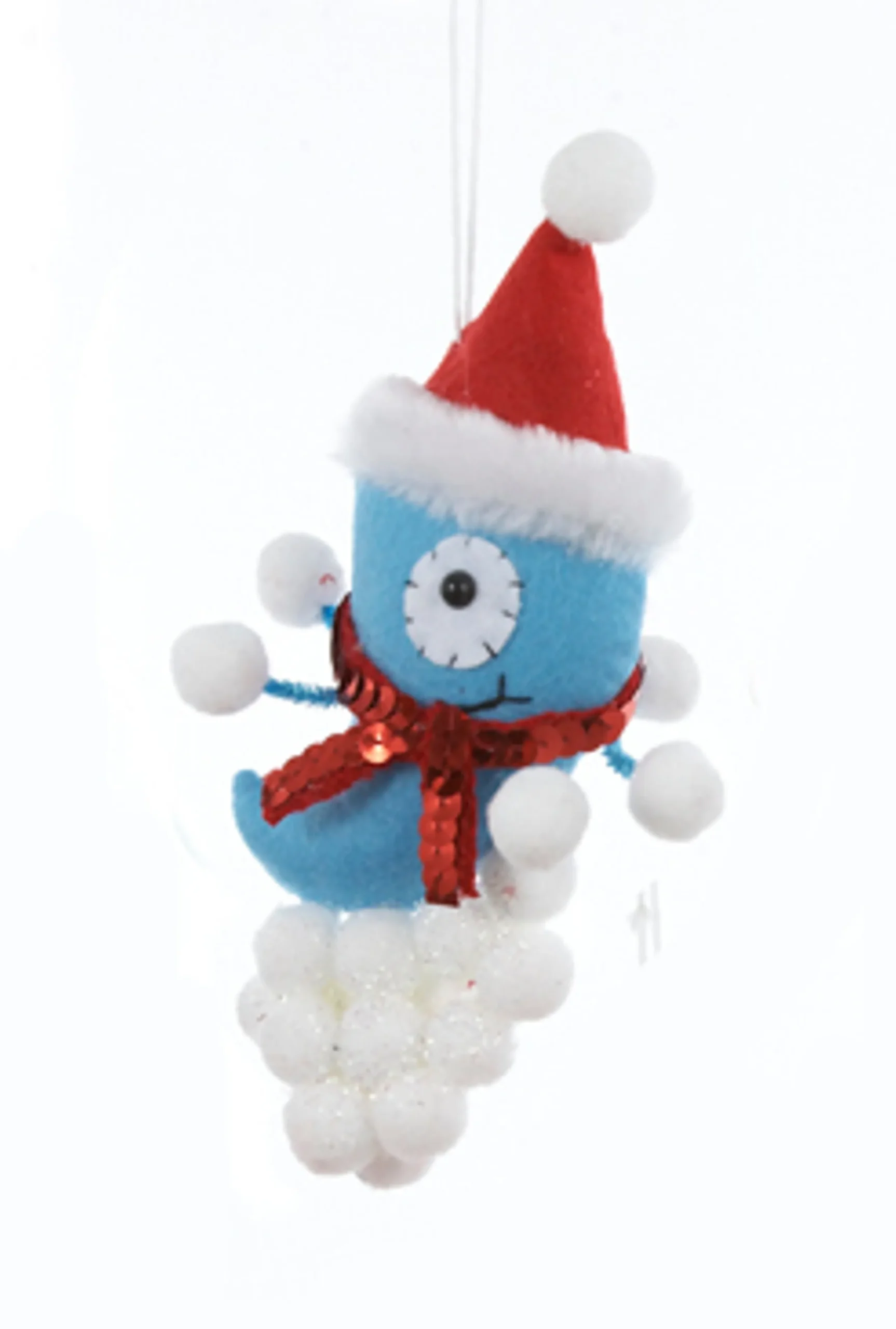 “Stan” The Blue Alien Features A Blue Body Wearing A Santa Hat And Red Sequin Embellished Scarf Sitting On Top Of Artificial Snowballs