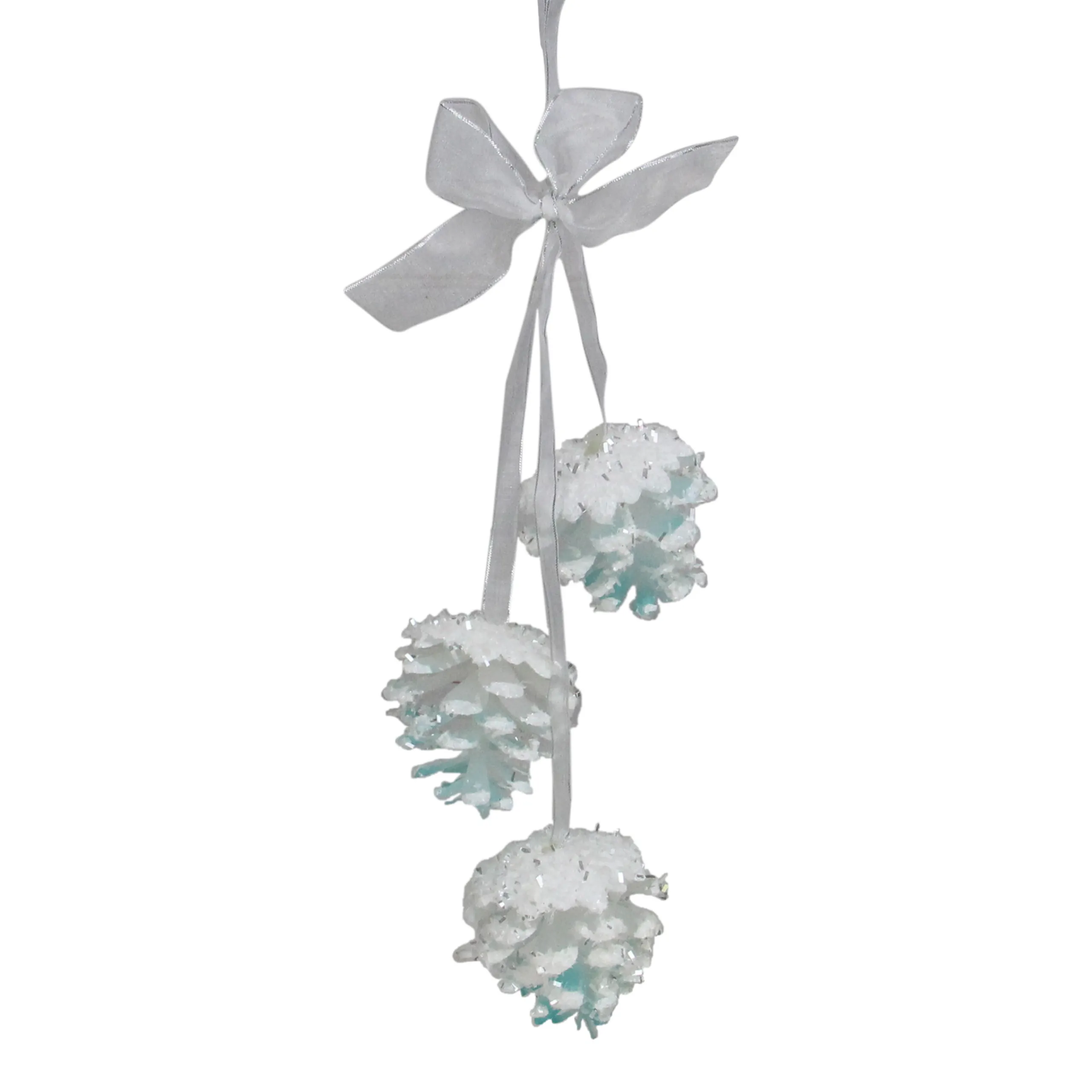 This Pinecone Embellished Ornament Is A Perfect And Elegant Addition To Your Christmas Tree This Holiday Season. This Ornament Has Shimmers With The Lights Of Your Tree With Three Pinecones Dangling All Different Lengths That Are White With Blue Accents And Embellished With Glitter. This Ornament Could Also Be Dangled From Your Mantel, Doorways Or Even Added To Your Tables Centerpiece.