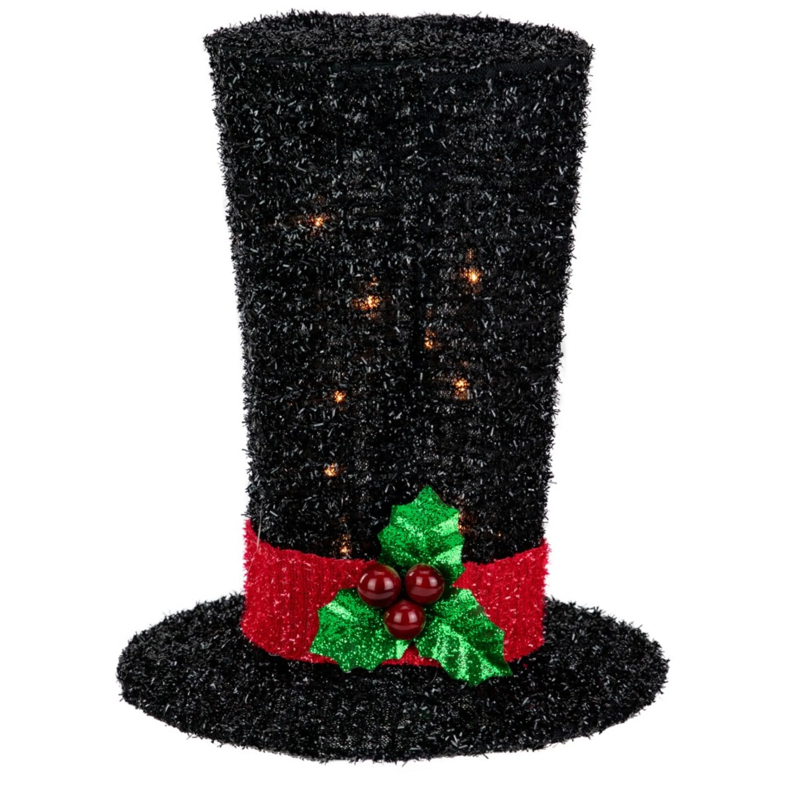 Add A Whimsical Touch To Your Christmas Tree Decor With This Fun Top Hat Christmas Tree Topper. This Traditional Black Tinsel Top Hat Comes Decorated With A Red Band And Glittered Holly Berry Accent. Perfect On A Tree But Also On Mantles Or Tabletops.