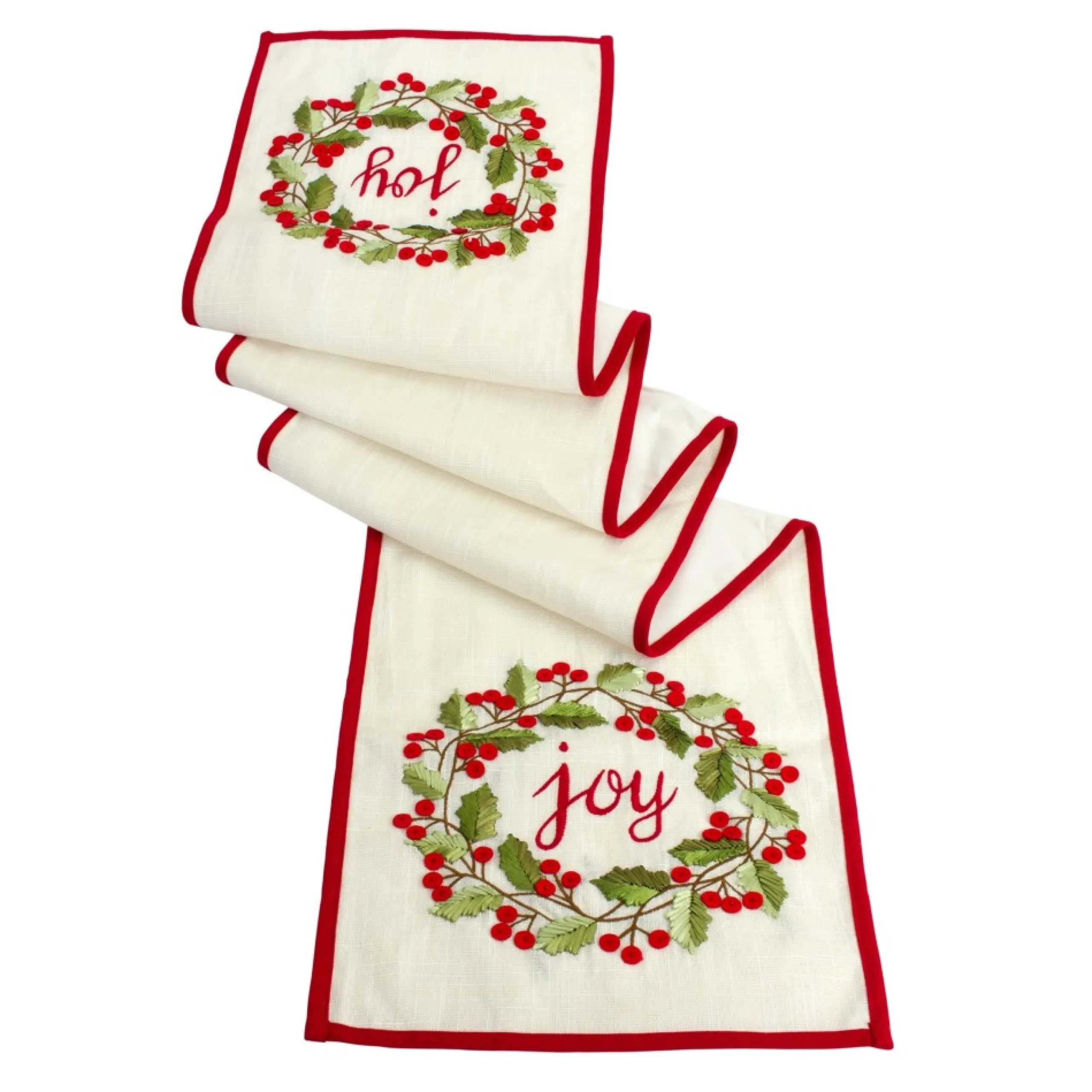Linens*Melrose 72″ Holly Wreath “Joy” Christmas Table Runner