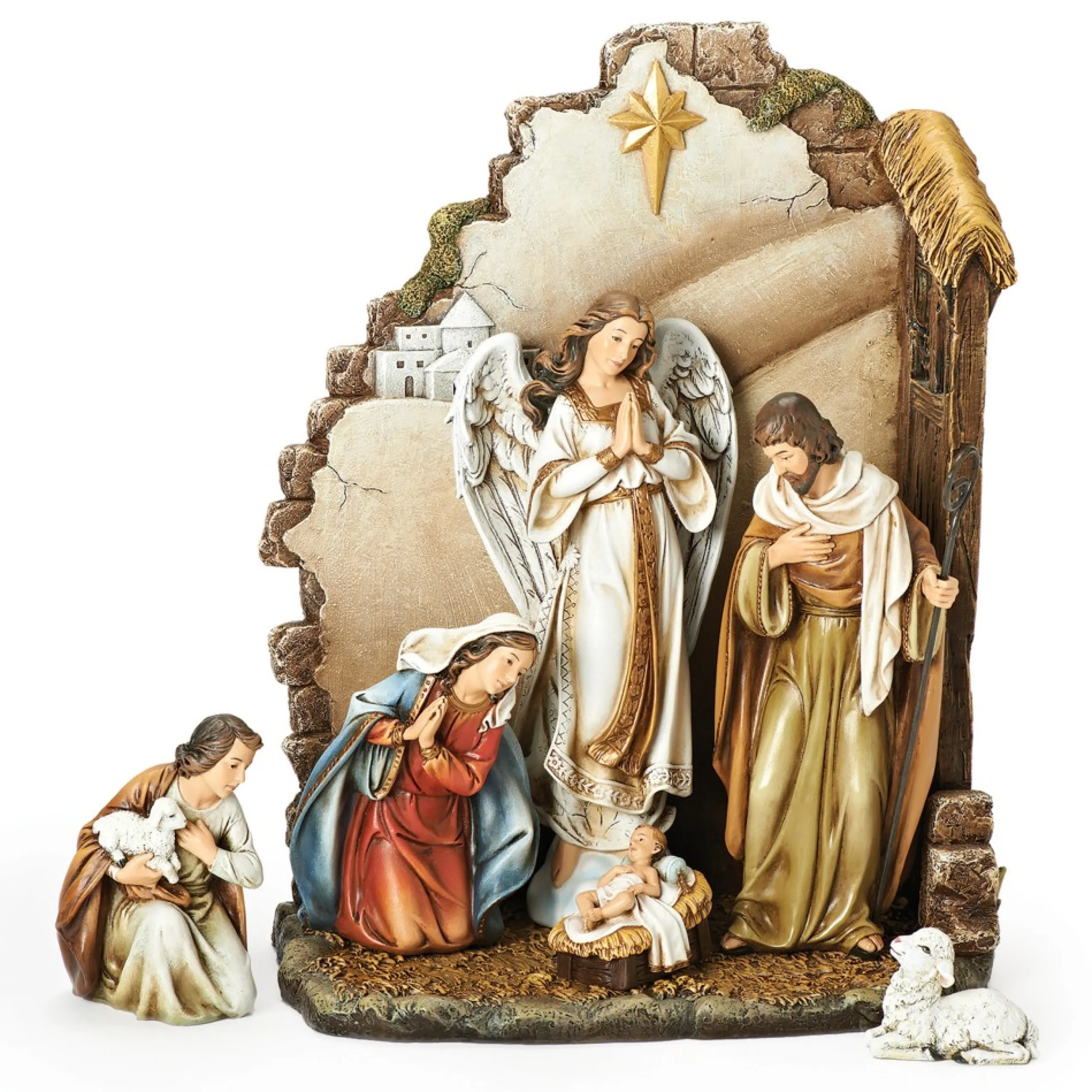 Nativities*Roman 7-Piece Brown Joseph’s Studio Nativity With Back Wall Christmas Table Top Decoration 12