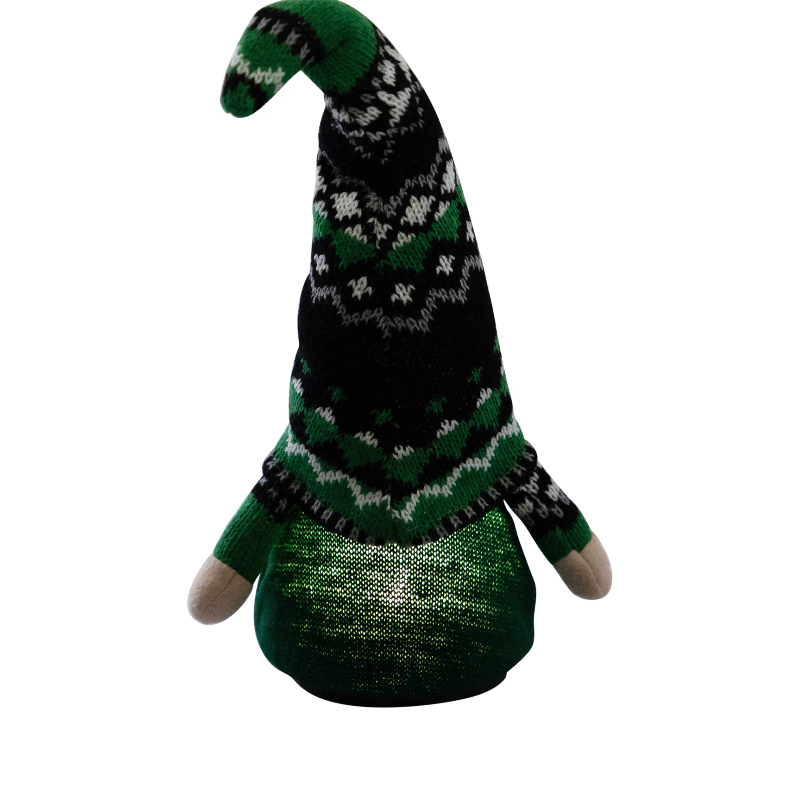Gnome Wears A Knitted Irish Fair Isle Pointy Gnome Hat With A Solid Green Sweater