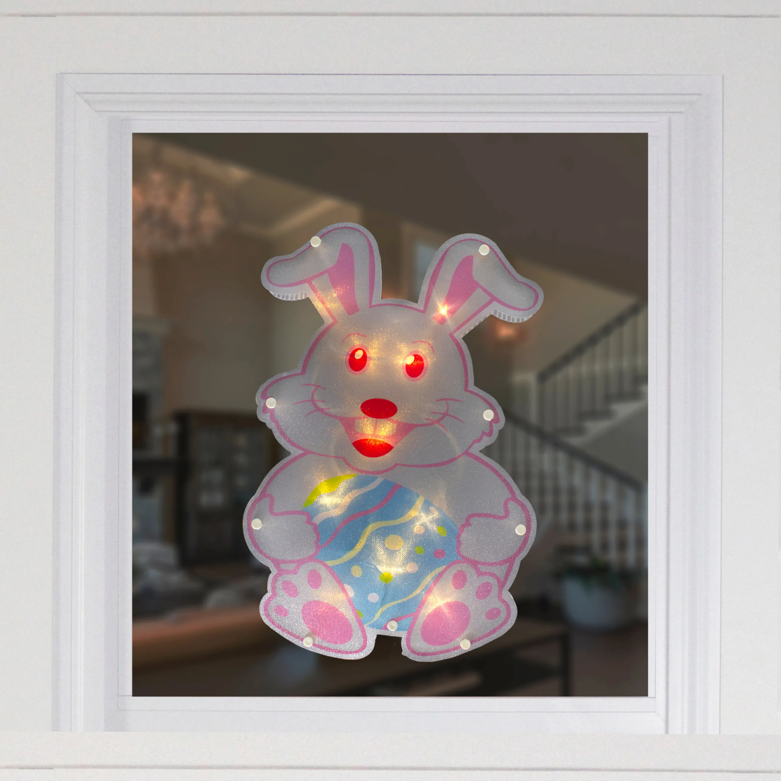 Illuminate Your Windows This Easter With This Cute Shimmering Bunny Silhouette. The Bunny Is Bright Pink And White, Holding A Blue Decorated Easter Egg. This Decoration Looks Adorable During The Day And Comes To Life At Night With A Beautiful Shimmer Of Led Lights. Perfect For Spring Or Easter Decorating.