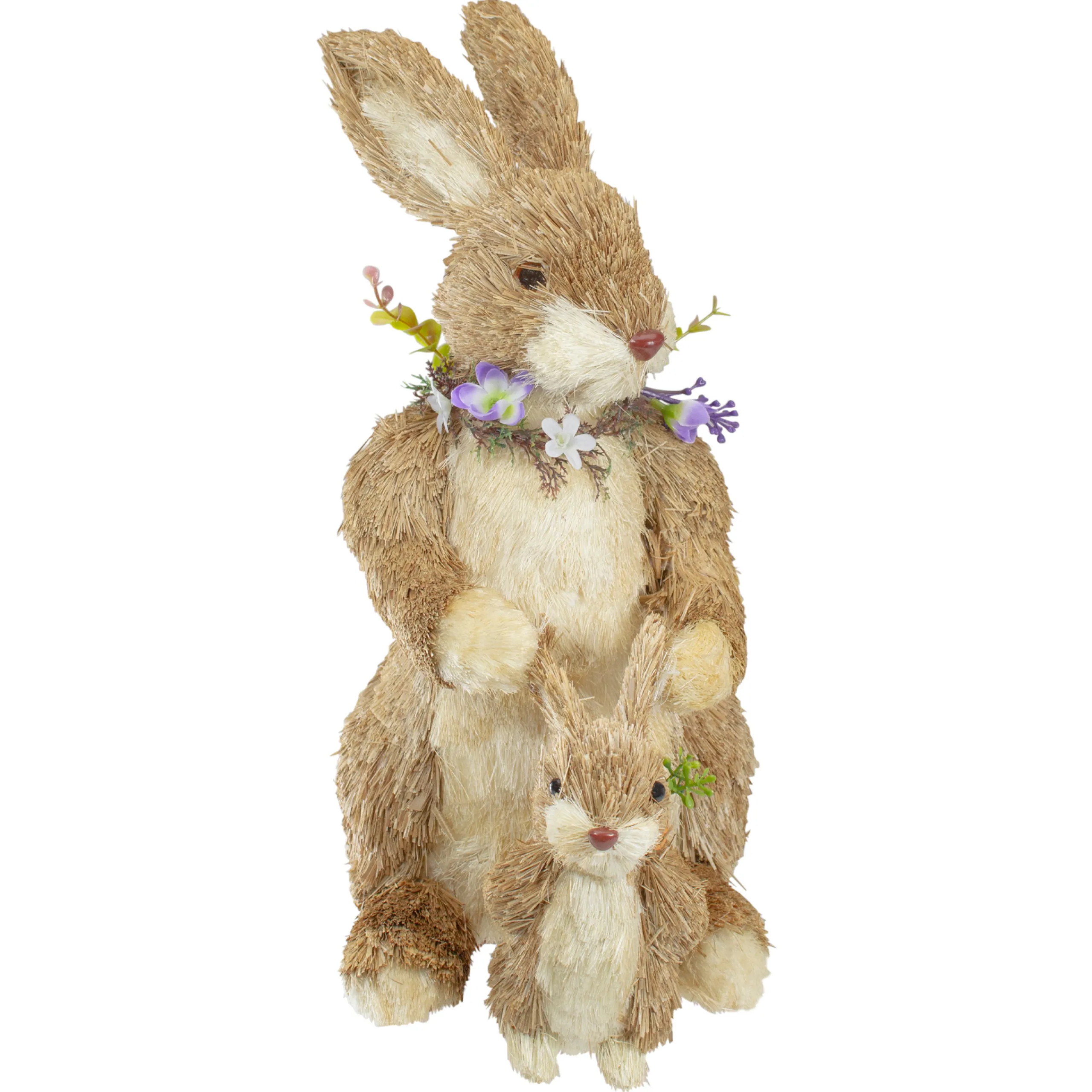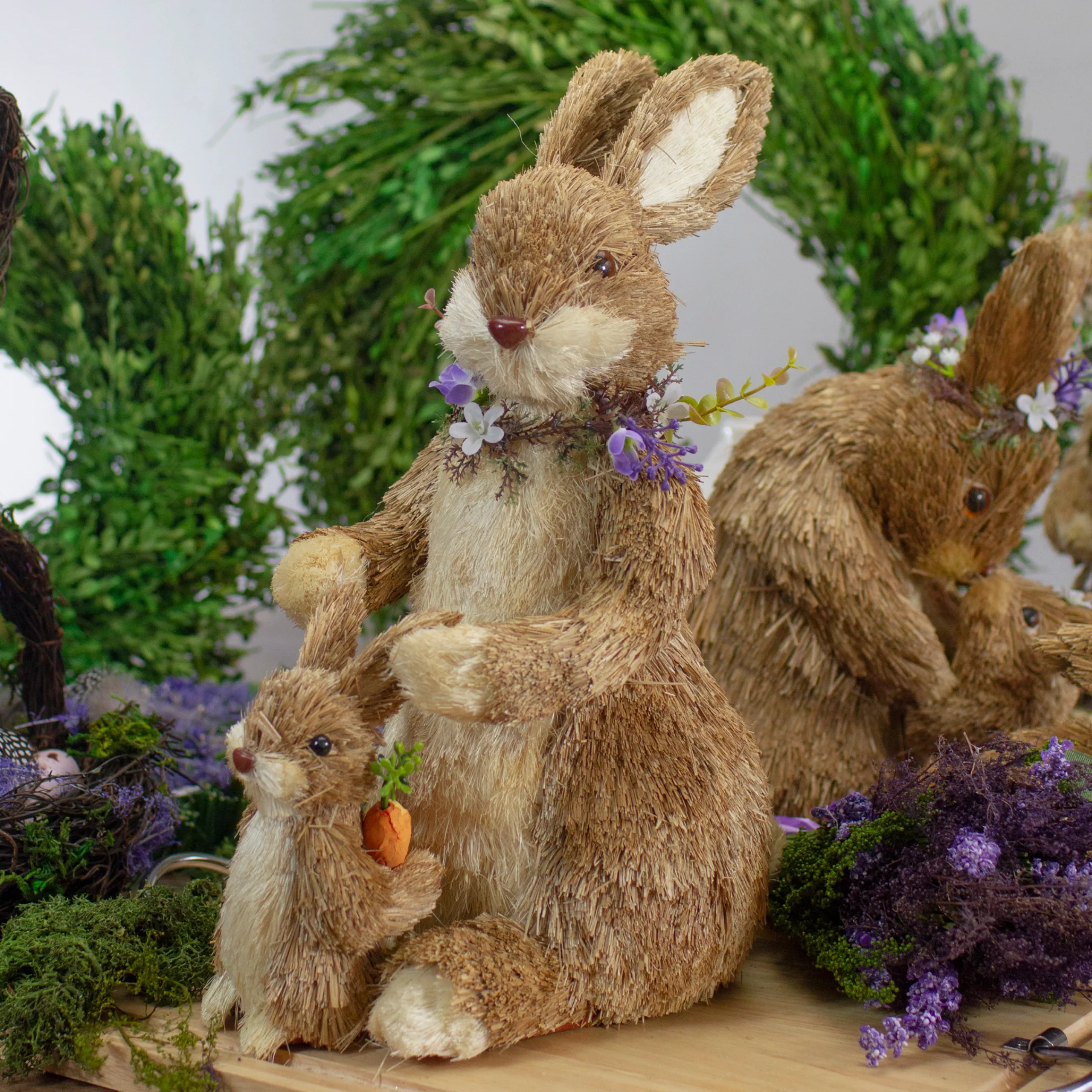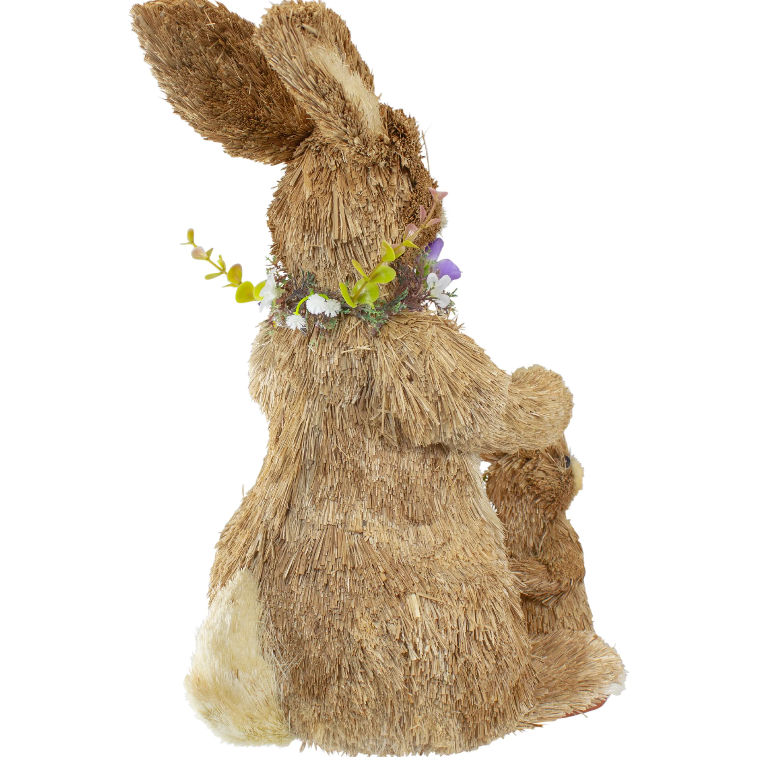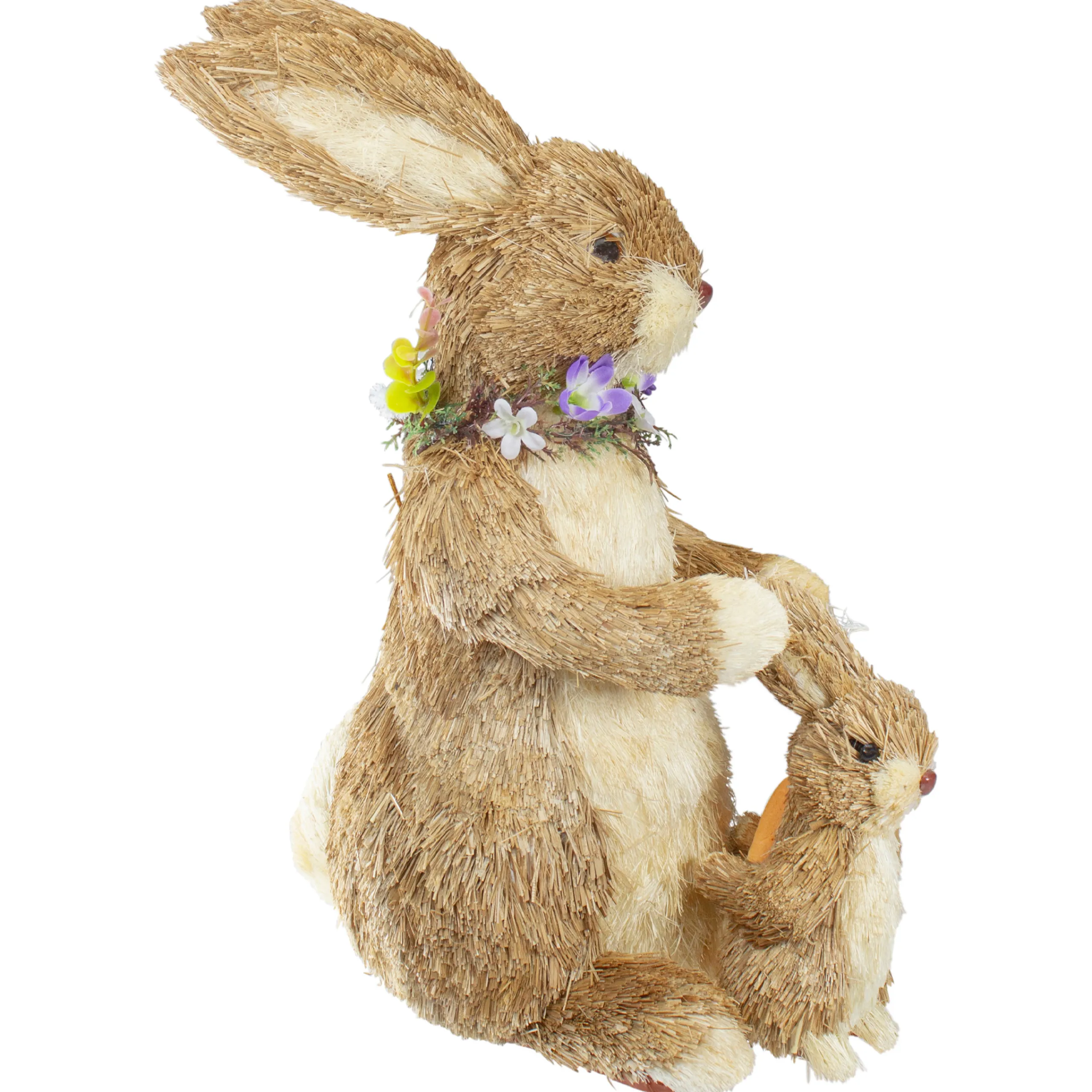 Darling Mother And Baby Easter Bunny Duo Will Add A Sweet Touch To Any Easter Display. The Mother Rabbit Wears A Floral Necklace While The Baby Hides A Carrot Behind His Back. Made Of Sisal And Plastic, This Figure Is Versatile And Fits In At Any Home.