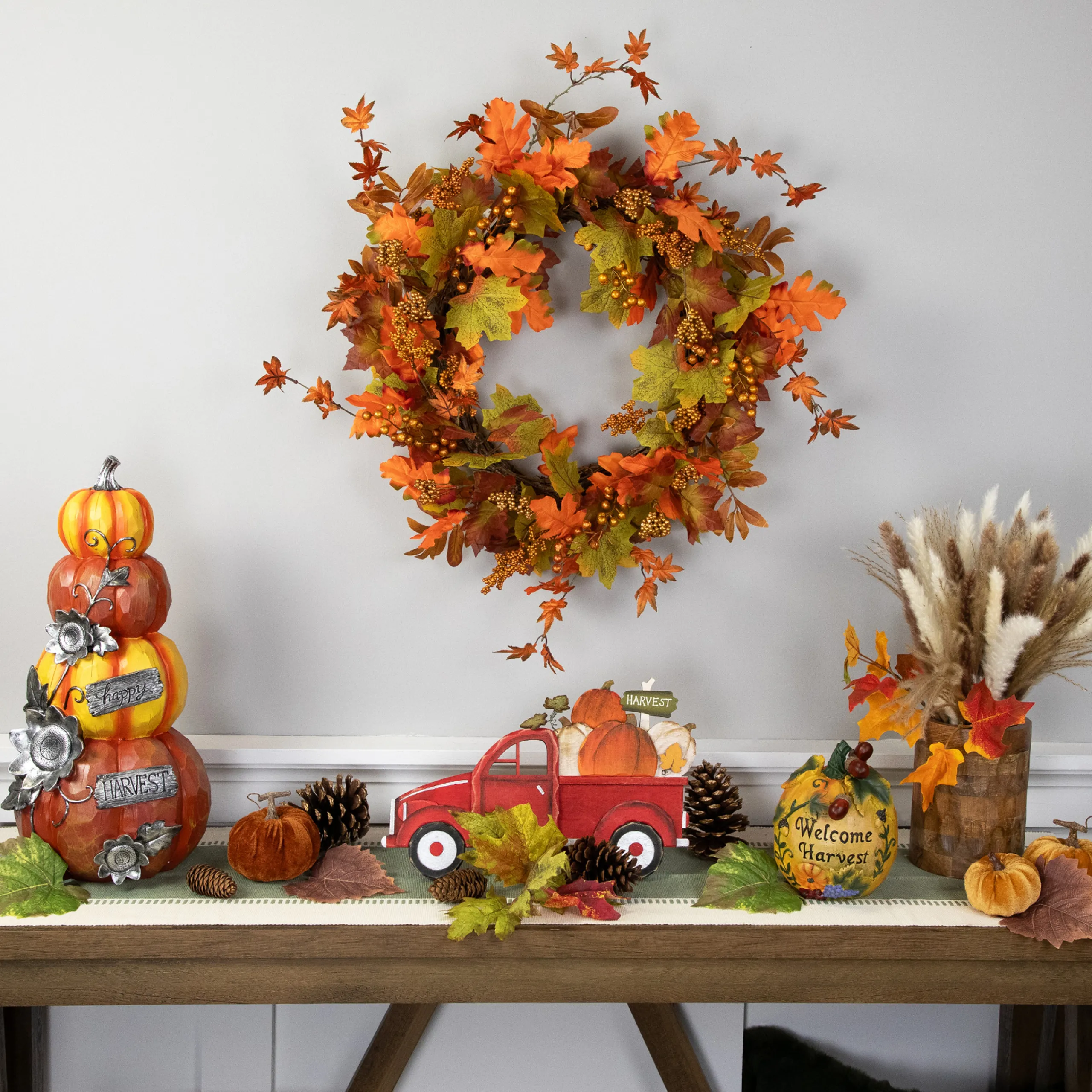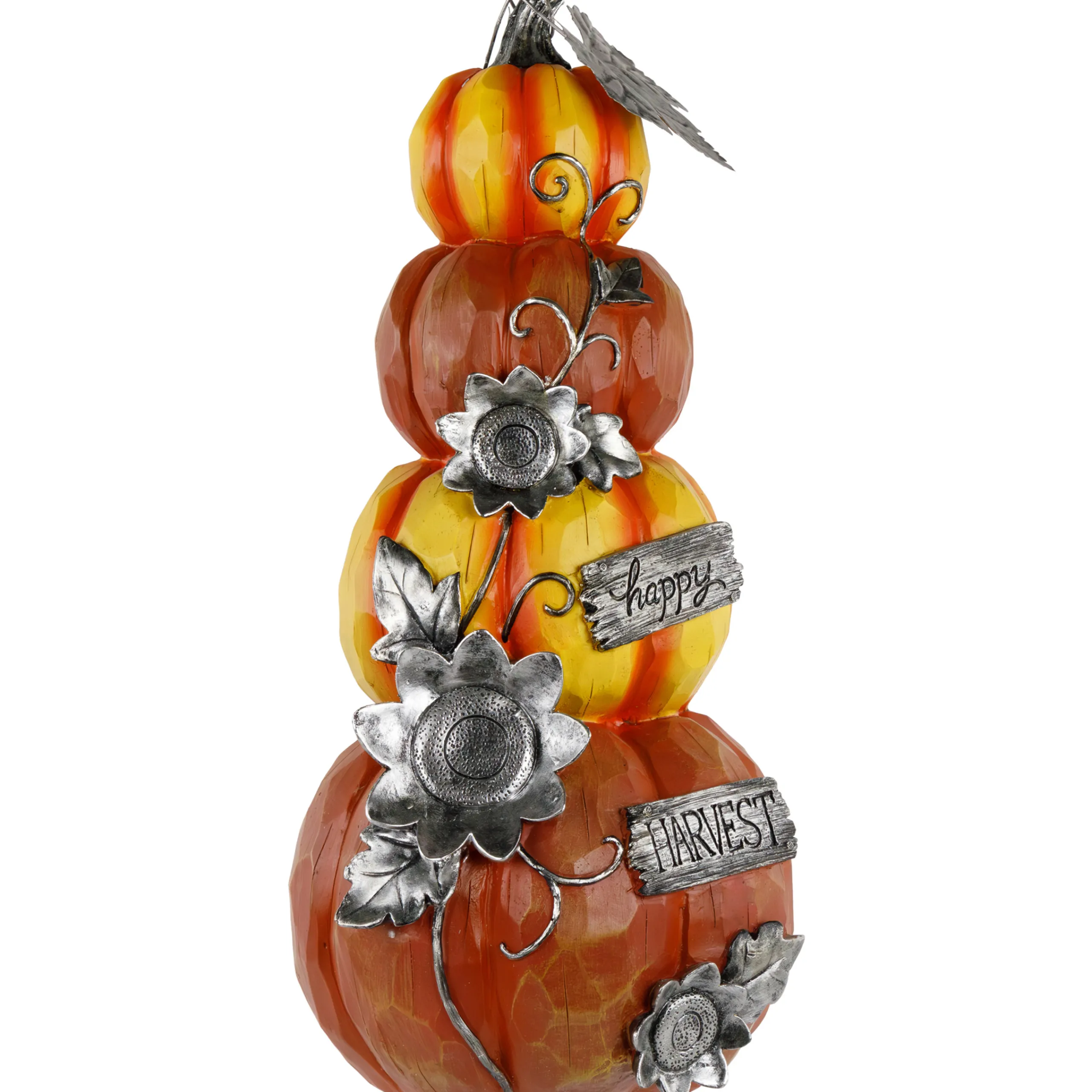 Put A Different Spin On Your Autumn Decor With This Stacked Pumpkin Statue. This Pumpkin Is Accented With Silver Wildflowers With Faux Wood Plaques That Read ‘Happy Harvest’. This Pumpkin Is Perfect For Putting Near Your Front Door Or In Your Garden. The Perfect Addition To Your Thanksgiving And Fall Decor.