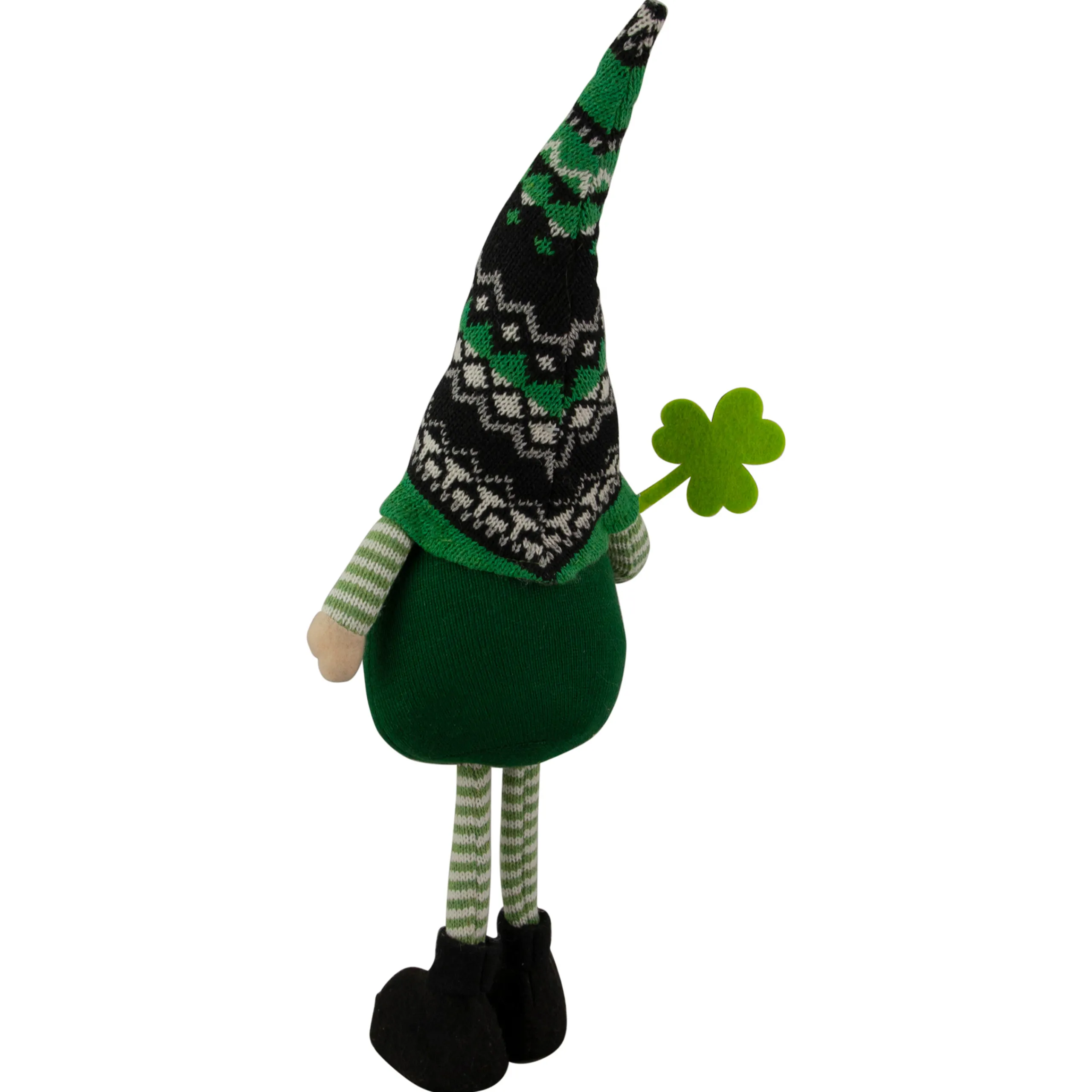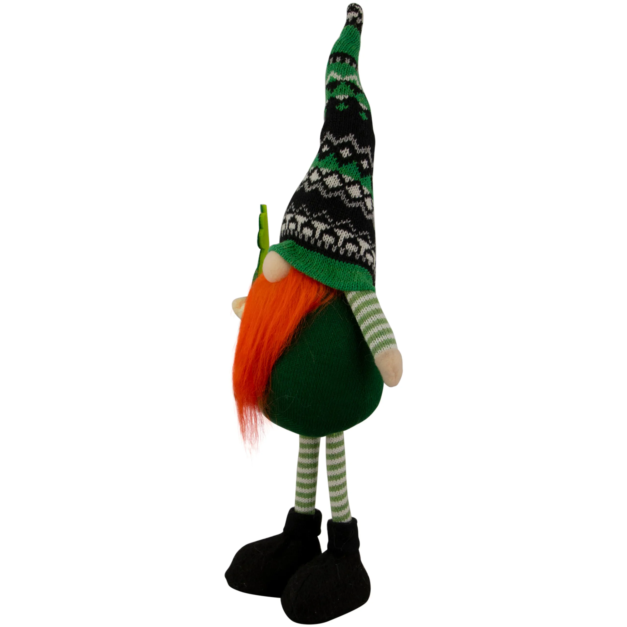 Gnome Wears A Knitted Irish Fair Isle Pointy Gnome Hat, A Green Sweater With Striped Sleeves And Striped Pants
