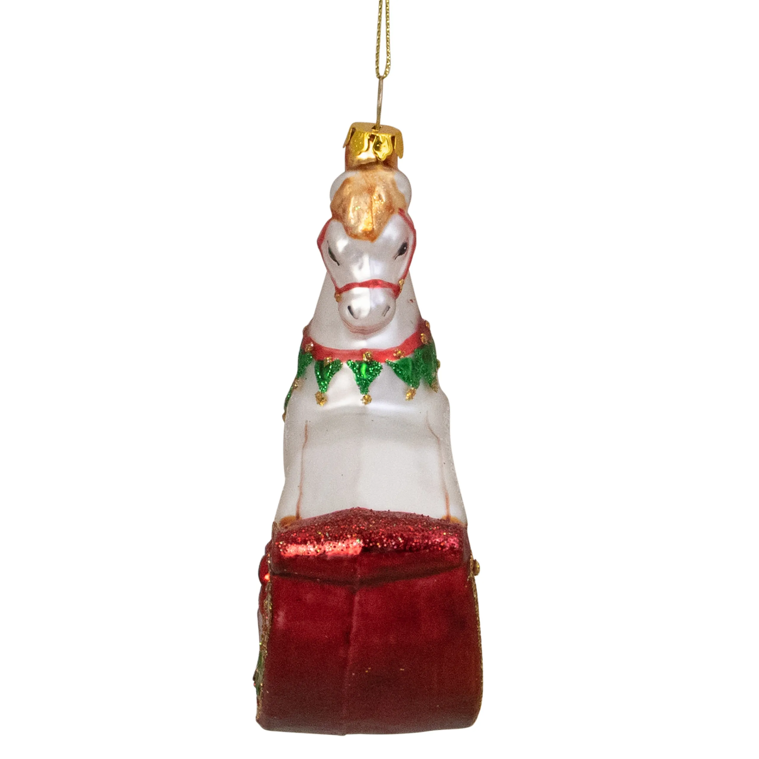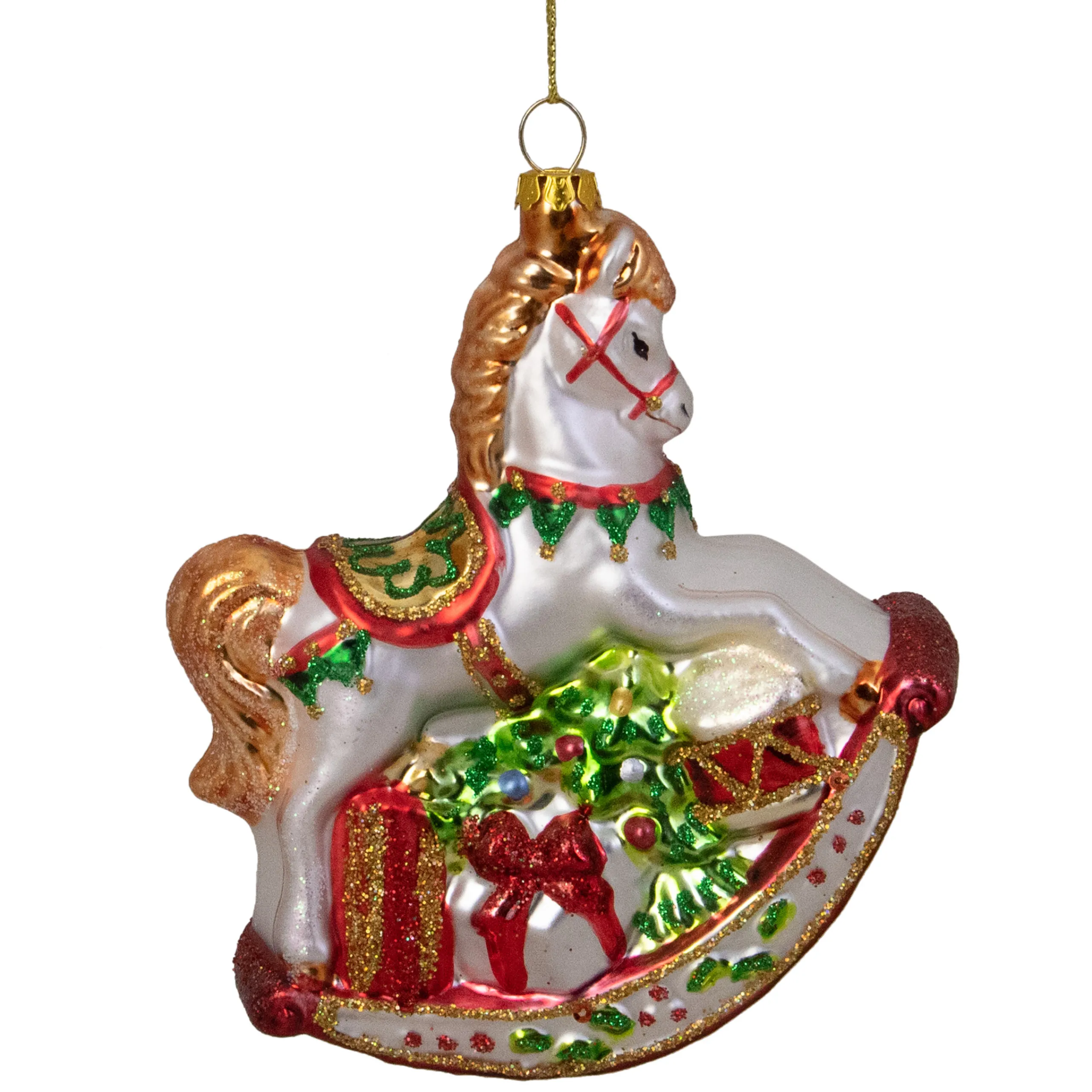 Take A Ride On This Festive Rocking Horse This Christmas Season. This Ornament Features A White Rocking Horse With A Gold Mane, A Red Base With Holly Leaves And Berries, And A Tree With Presents. It Has Glitter Accents Throughout To A Little Sparkle To Your Tree, Your Mantle, Or Anywhere You Wish To Add A Little Bit Of Flair.