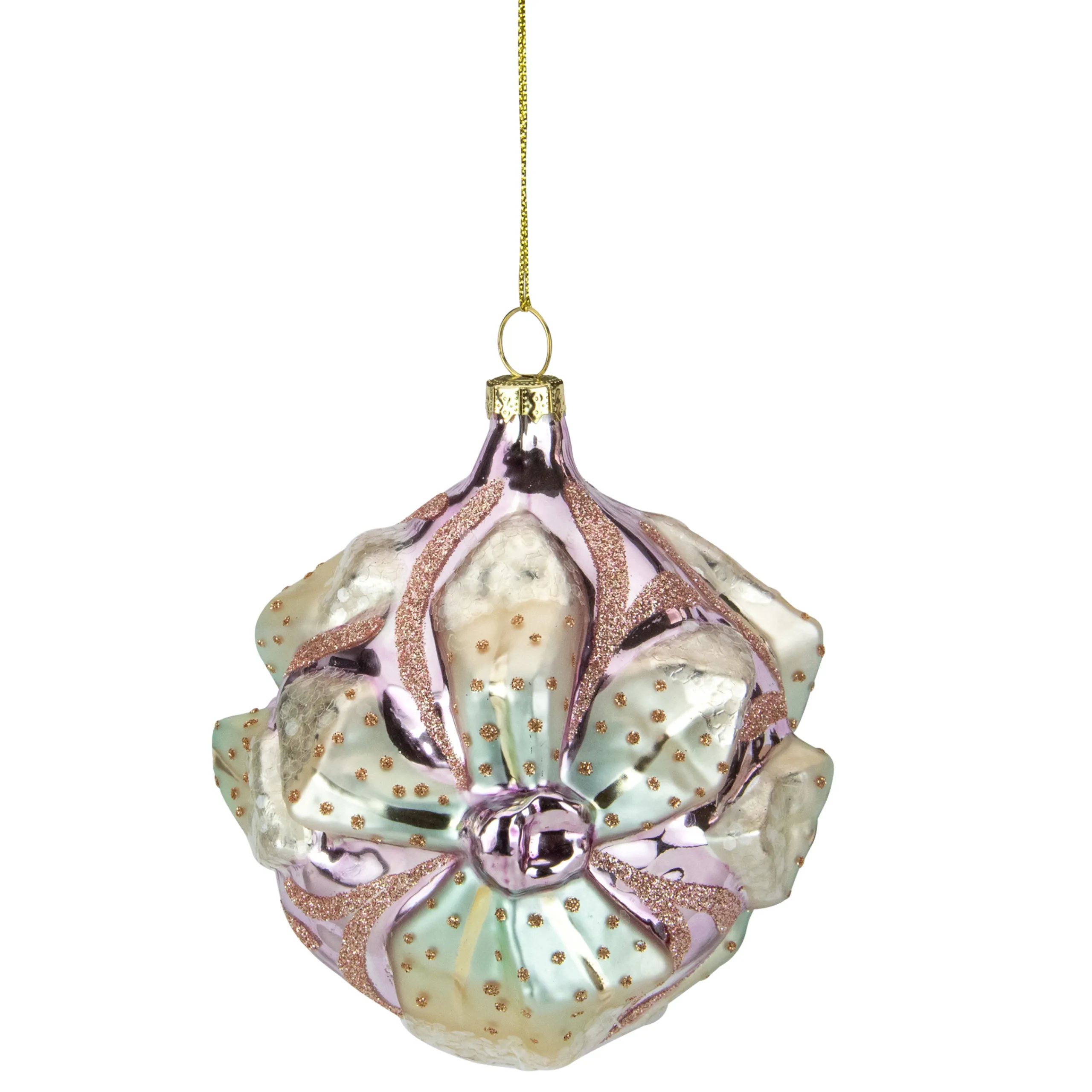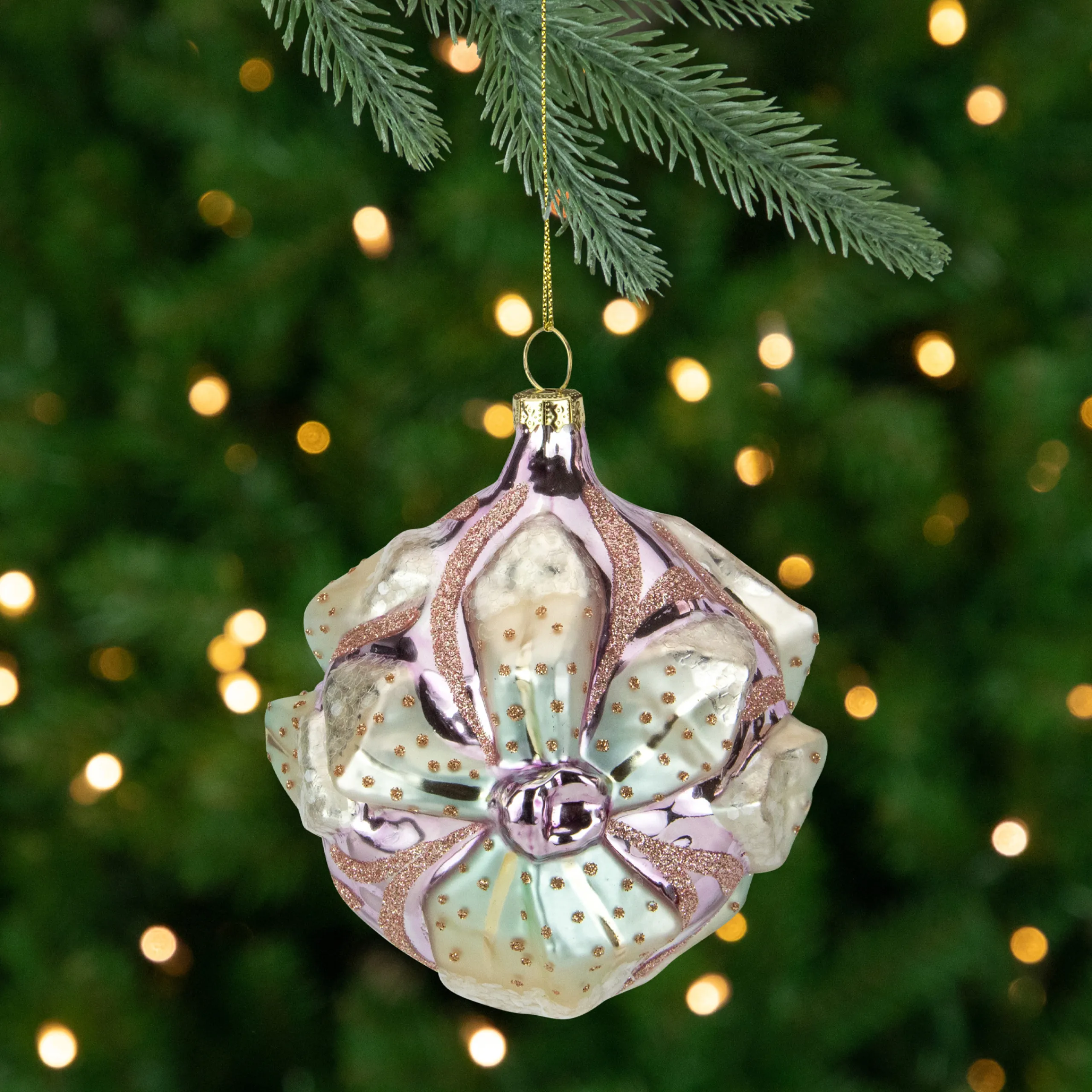 Add This Beautiful Flower Ornament To Your Holiday Decor For A Special Pastel Pop! Pink Glass Bursts Into Minty Green Flowers. Rose Gold Glitter Adds The Perfect Amount Of Sparkle. A Perfect Addition To Your Tree From Season To Season.