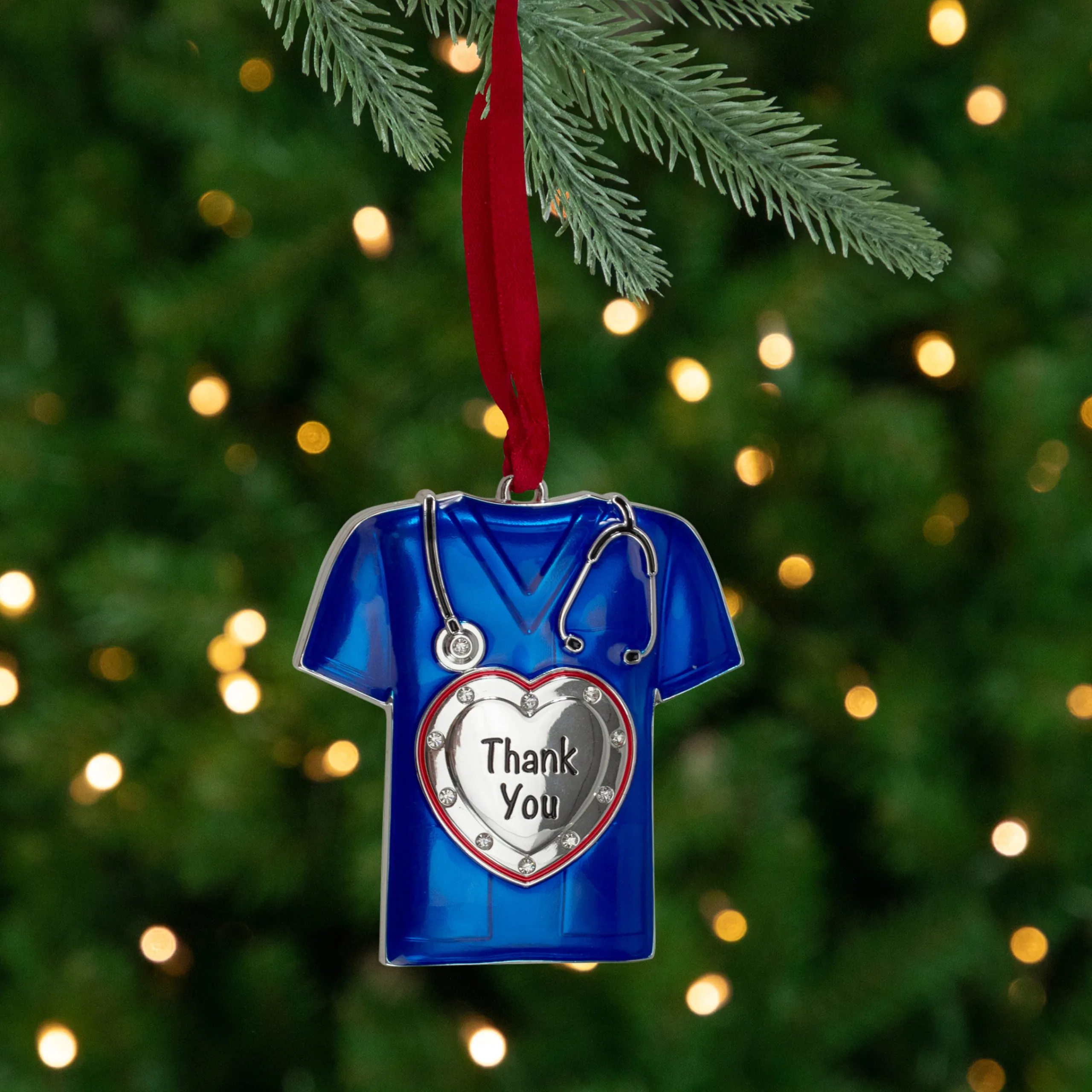 Give The Gift Of Thanks To That Special Medical Worker This Season. It’s Been A Rough Year And Our Front Liners Definitely Deserve Recognition. Features Blue Scrub Shirt With Stethoscope, Crystals And Thank You Heart. Perfect On A Tree Or In Place Of A Bow On A Gift.