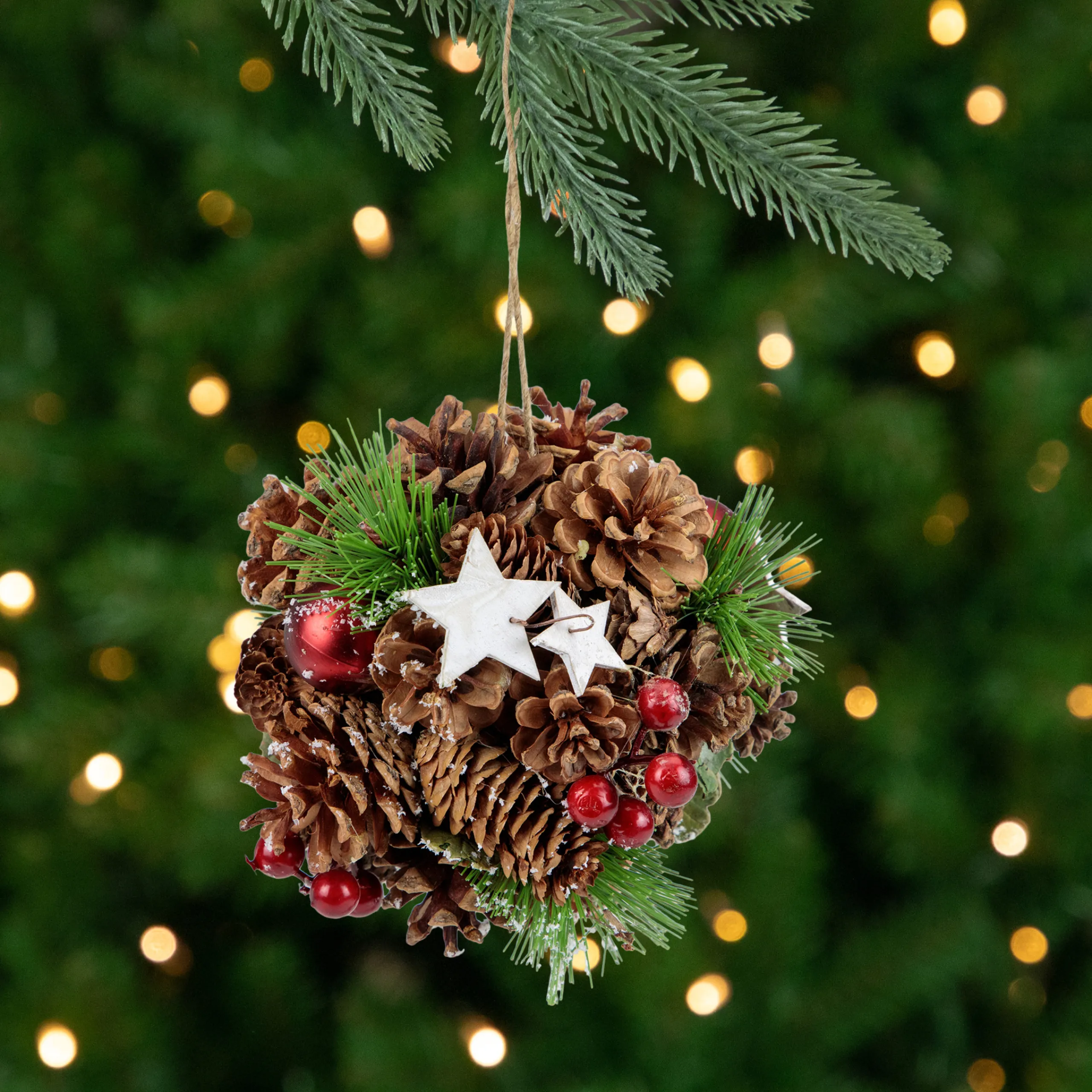 Natural Hanging Ball Ornament Is Made Up From Pine Cones With Wooden Star Accents, And Red Balls. The Ornament Also Comes Accented With Pine Foliage, Berries And Wooden Twigs. This Country Rustic Style Ornament Is Fully Dimensional And Comes Ready For Hanging On A Cord. Perfect For Adding A Natural Touch To Your Christmas Tree.