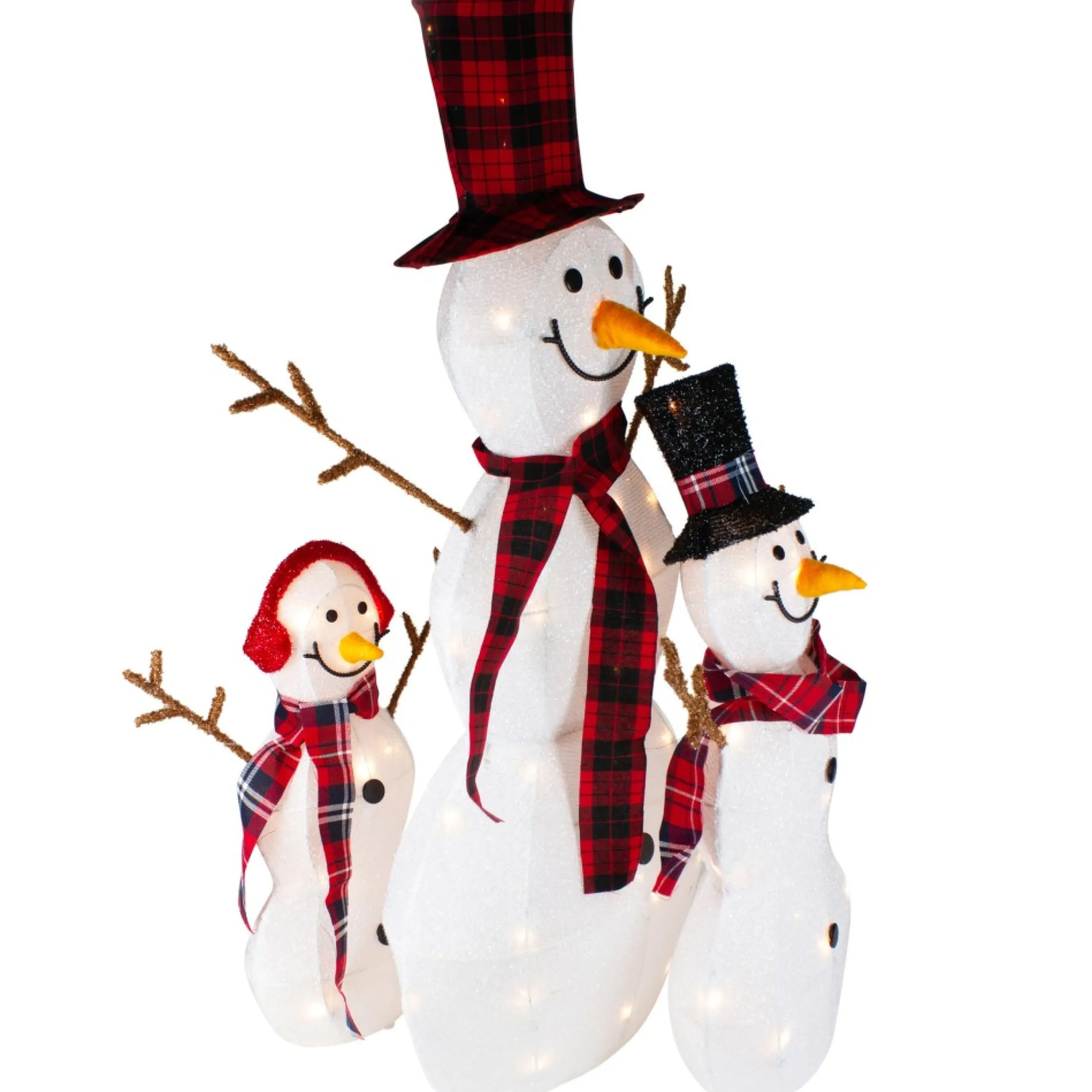 It’s The Most Wonderful Time Of The Year! Bring Some Frosty Friends To Your Holiday Display With This Snowmen Family Set. The Larger-Sized Snowman Wears A Red And Black Plaid Hat With A Matching Scarf. The Medium-Sized Snowman Wears A Blue And Red Plaid Scarf With A Black Hat With A Matching Plaid Stripe. The Smallest Snowman Wears A Blue And Red Plaid Scarf With Red Ear Muffs. These Snowmen Are Pre-Lit By Clear Mini Lights And Create A Unique Glow To Your Decor. The Smiling Faces Of The Snowmen Will Create A Warm And Inviting Touch To Any Area You Display Them For Years To Come.