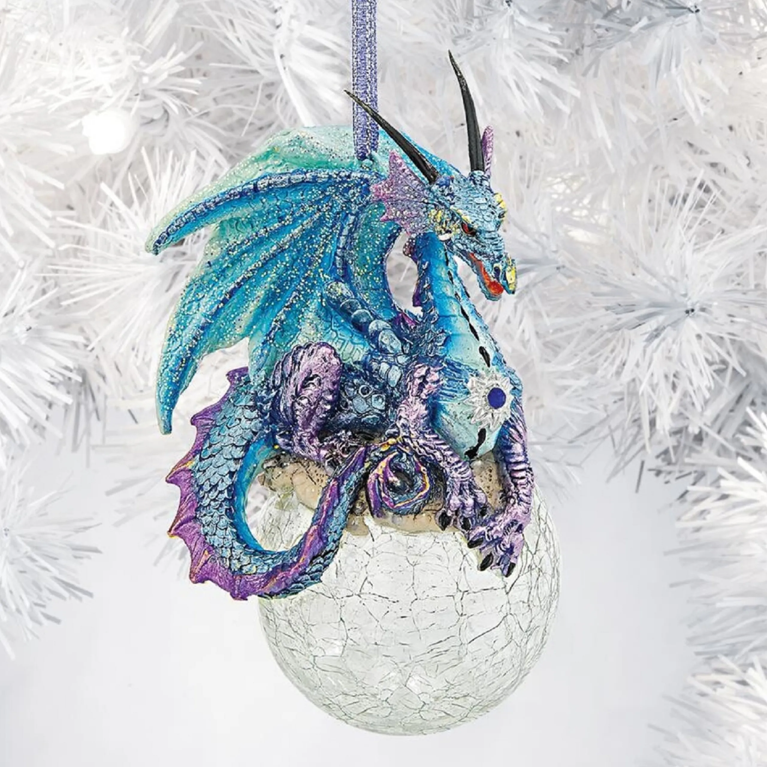 This Is An Absolutely Gorgeous Crackle Glass Ornament For The Tree This Year! This Mystical Dragon Sits Nicely On Top Of The Glass Ball Proudly Displaying The Shimmer And The Shine It Has To Offer. Your Tree Will Look Amazing This Year Adding This Ornament. Cast From A Quality Designer Resin, And His Hand Painted In Metallic Hues Making It Shine.