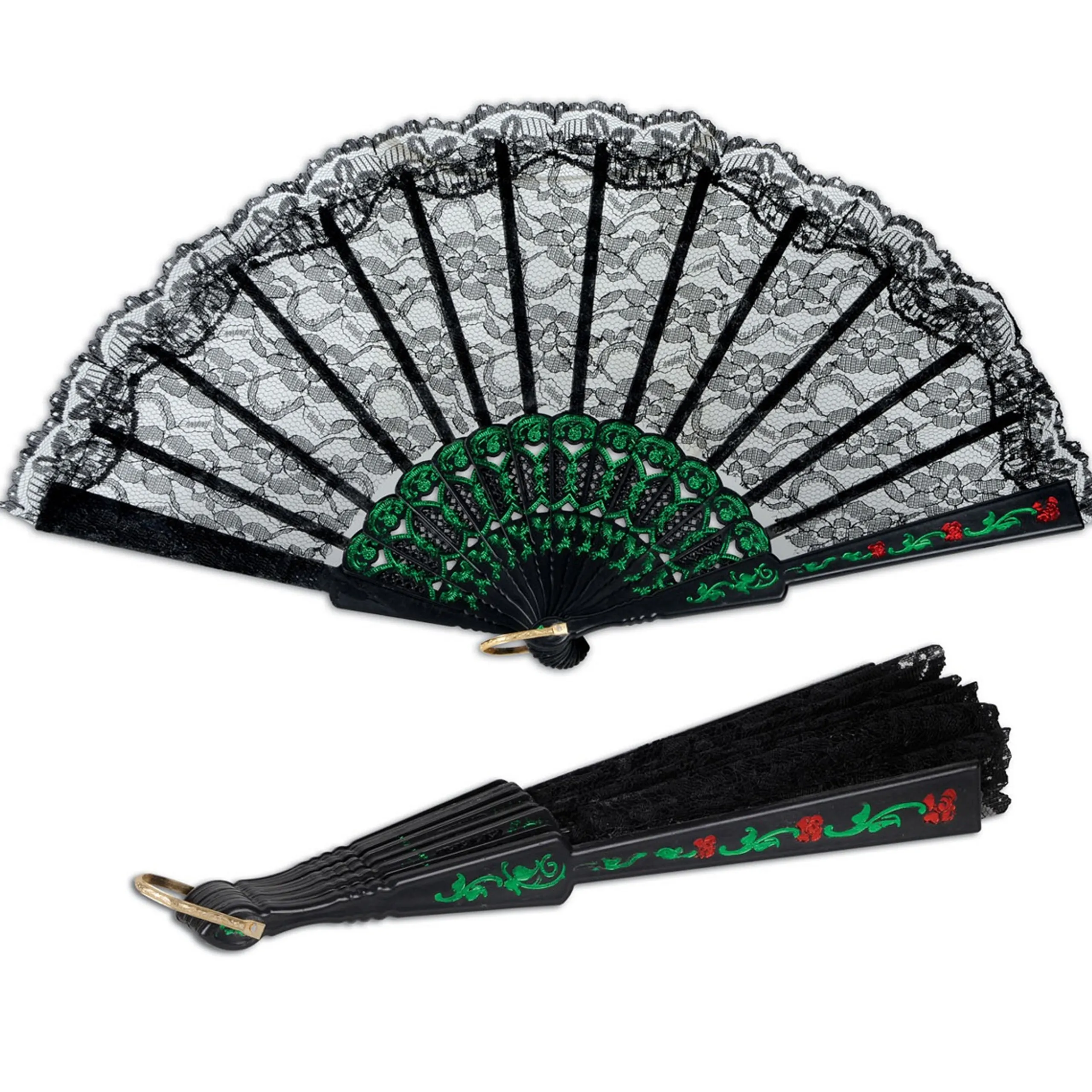 Pack Of 12 Black And Green Floral Fiesta Lace Fan Party Decors