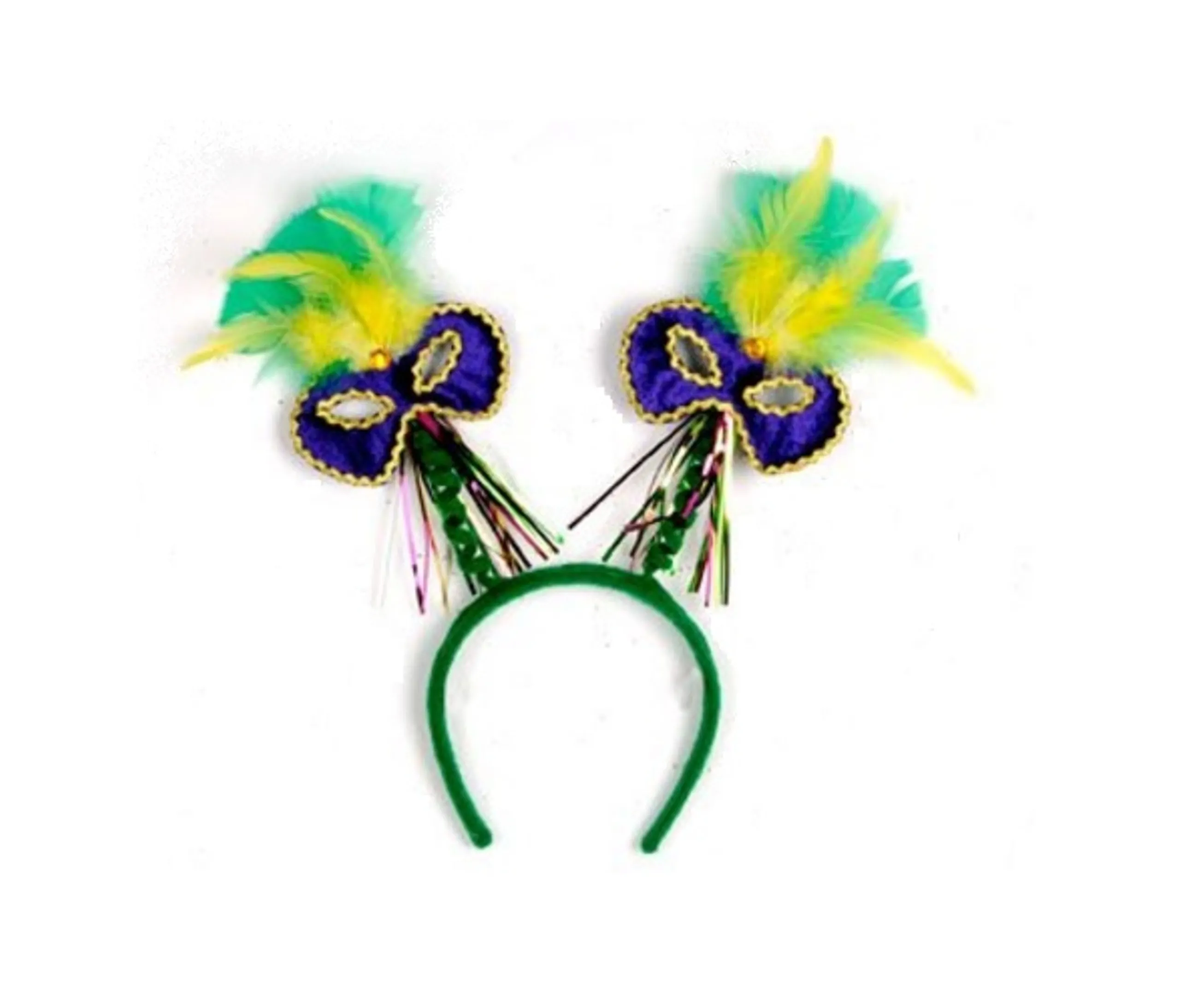 Celebrate Mardi Gras With These Adorable Bopper Headbands. Each Headband Features Fabric Covered Springs With Purple Masks And Feathers. The Masks Are Accented With Decorative Ribbons For Added Elegance!