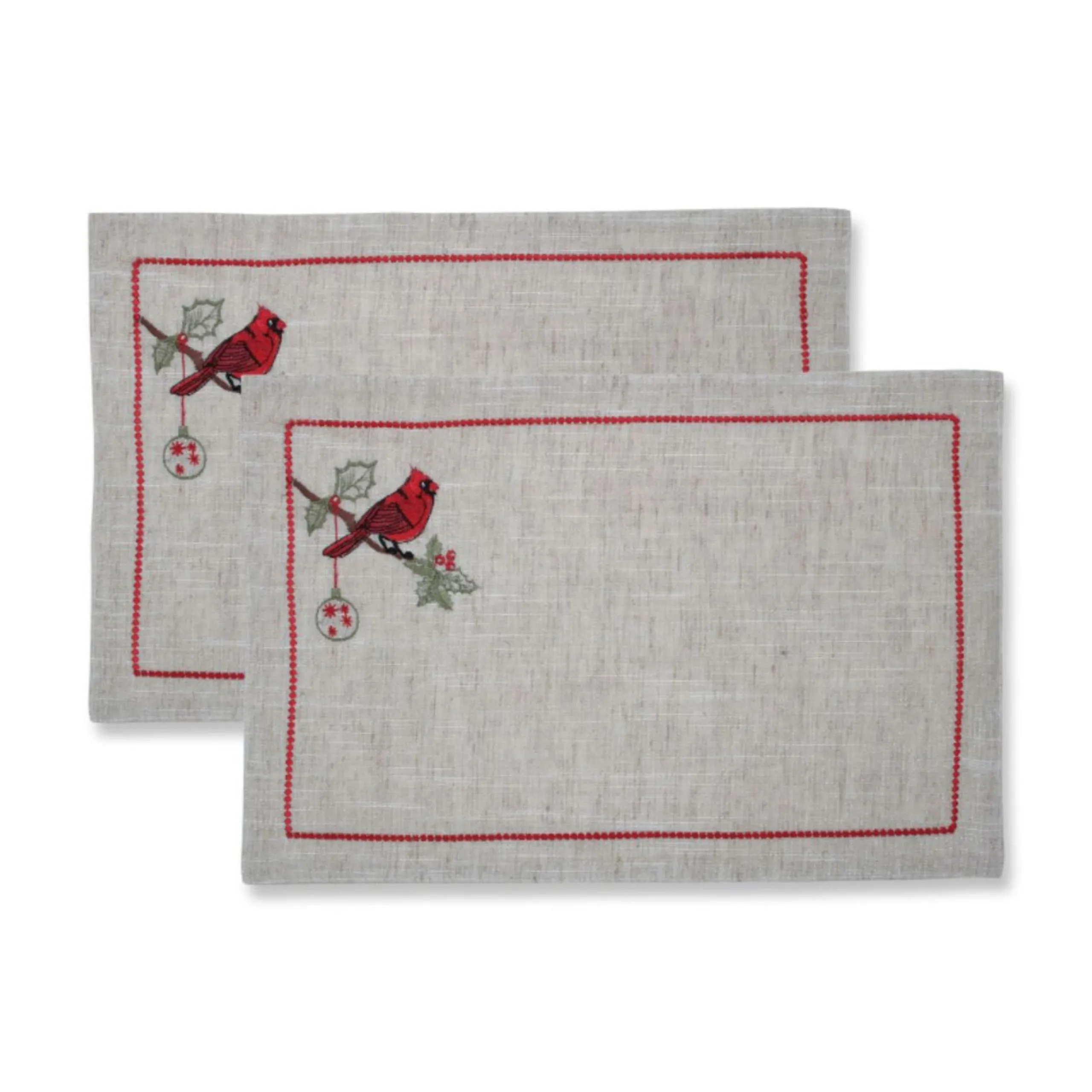 Pillow Perfect Set Of 2 Tan And Red Cardinal Embroidered Christmas Rectangular Placemats 18.5″