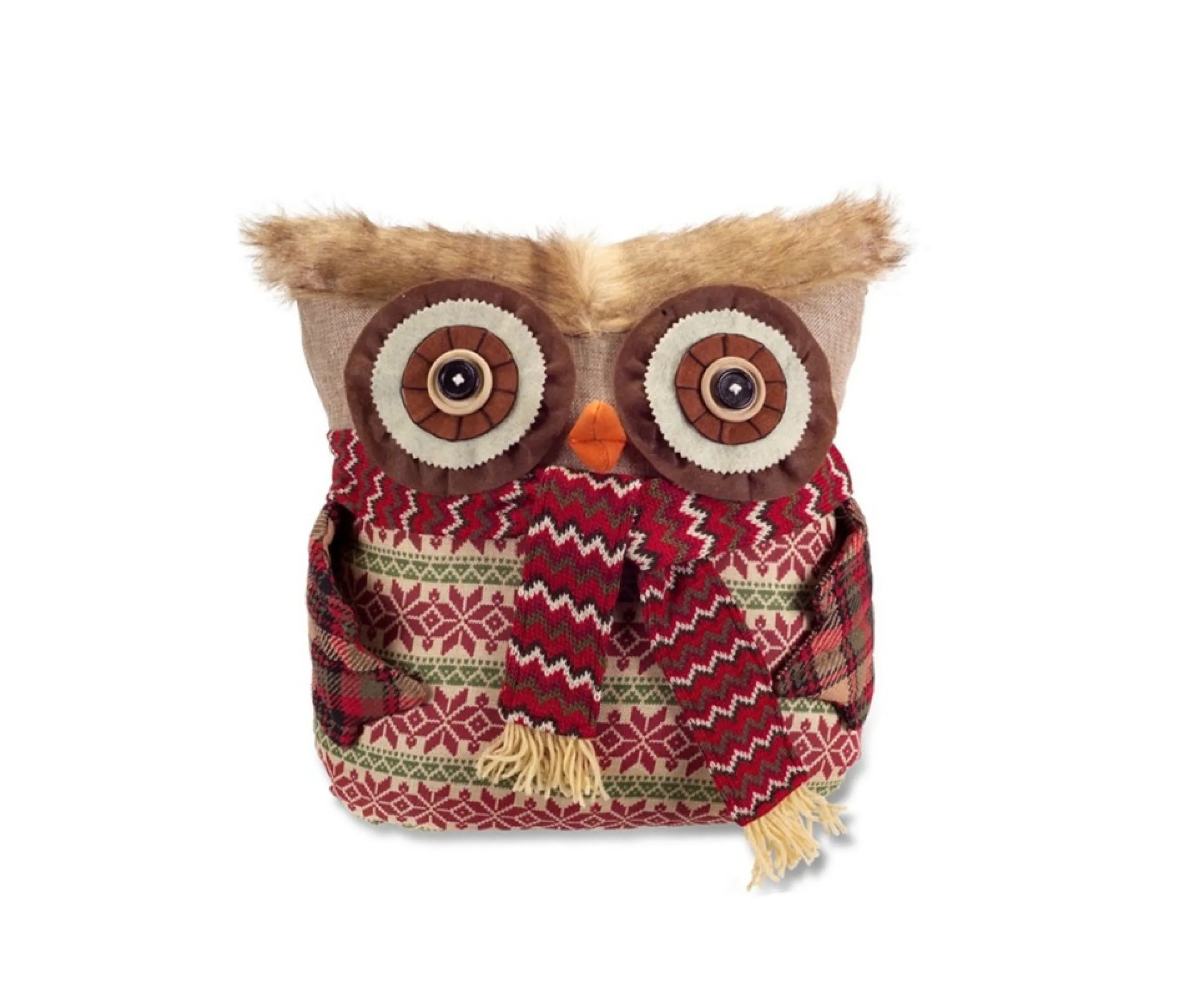 Christmas Themed Throw Pillow Shaped Like A Brown Owl Wearing A Red Scarf
