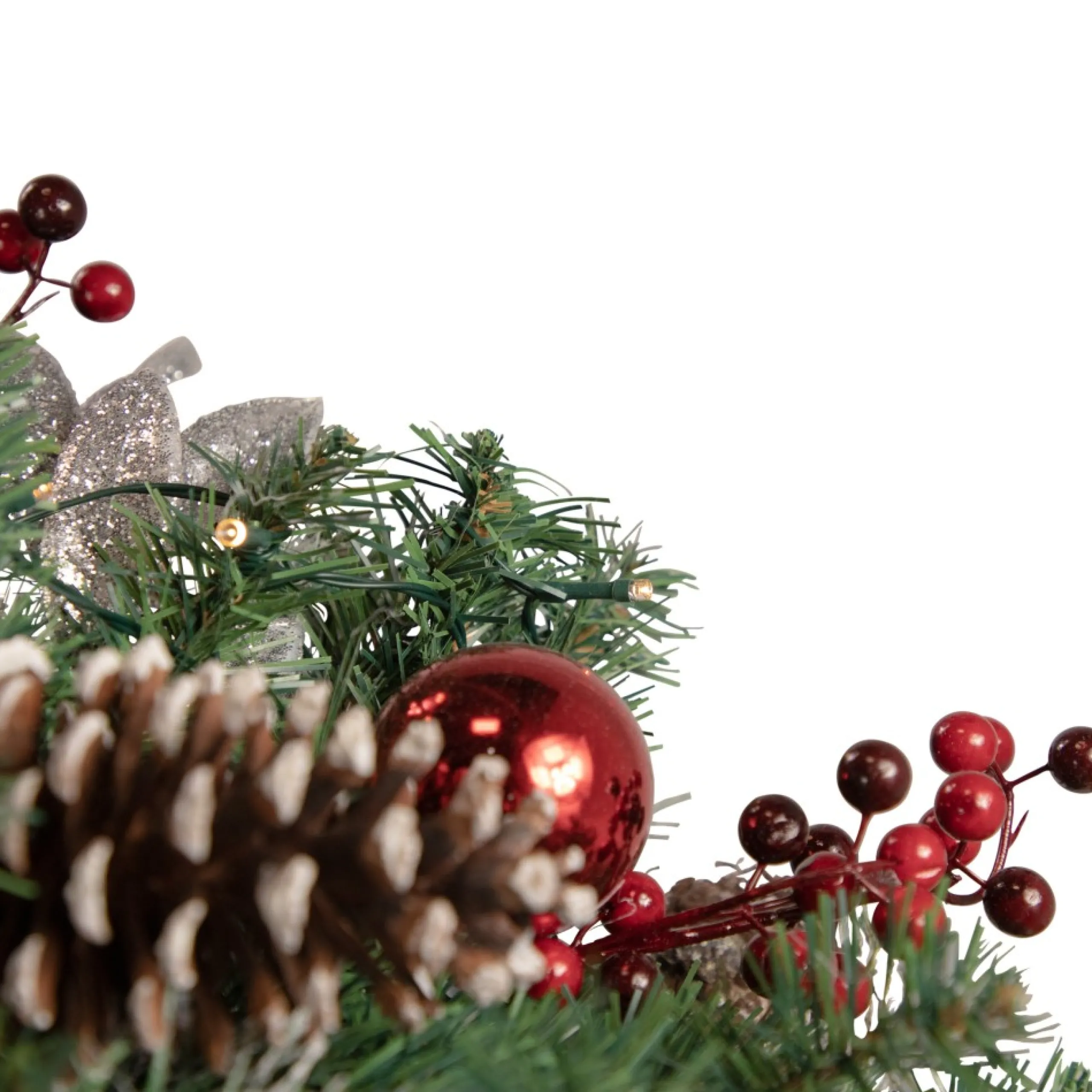 Put A Smile On The Mailman’s Face And All Who Pass By With This Mailbox Swag. This Pre-Decorated Swag Features Mixed Branches And Is Trimmed With Red Berries, Silver Glitter Leaves, Red Ball Ornaments, And Pine Cones For An Extra Festive Look. The Battery-Operated Warm White Led Lights Add A Touch Of Extra Magic. This Swag Securely Attaches To Your Mailbox With Wired Branches.