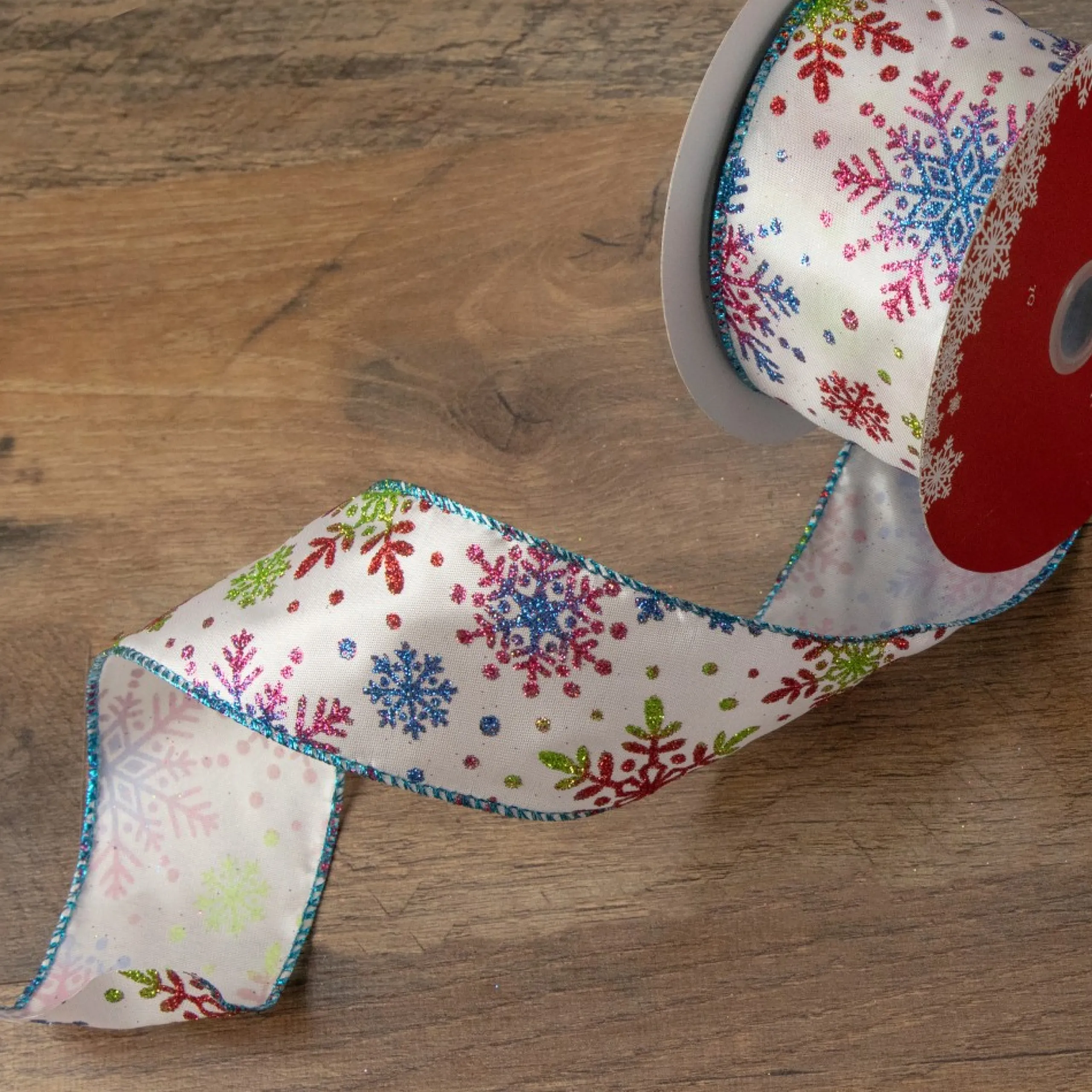 This Delightful White Satin Ribbon With Glittered Rainbow Snowflakes Would Be A Whimsical Way To Decorate Your Gifts And Home For The Holiday Season. This Wired Ribbon Will Help Everyday Designs Maintain Their Shape And Beauty. Whether You’Re A Florist, Event Planner, Or Diy Crafter This Wired Ribbon Is Convenient To Work With. Add This Ribbon To Holiday Gifts, Christmas Trees, Wreaths Or Garland To Add A Touch Of Sparkle And Festive Cheer To Your Home For The Holidays.