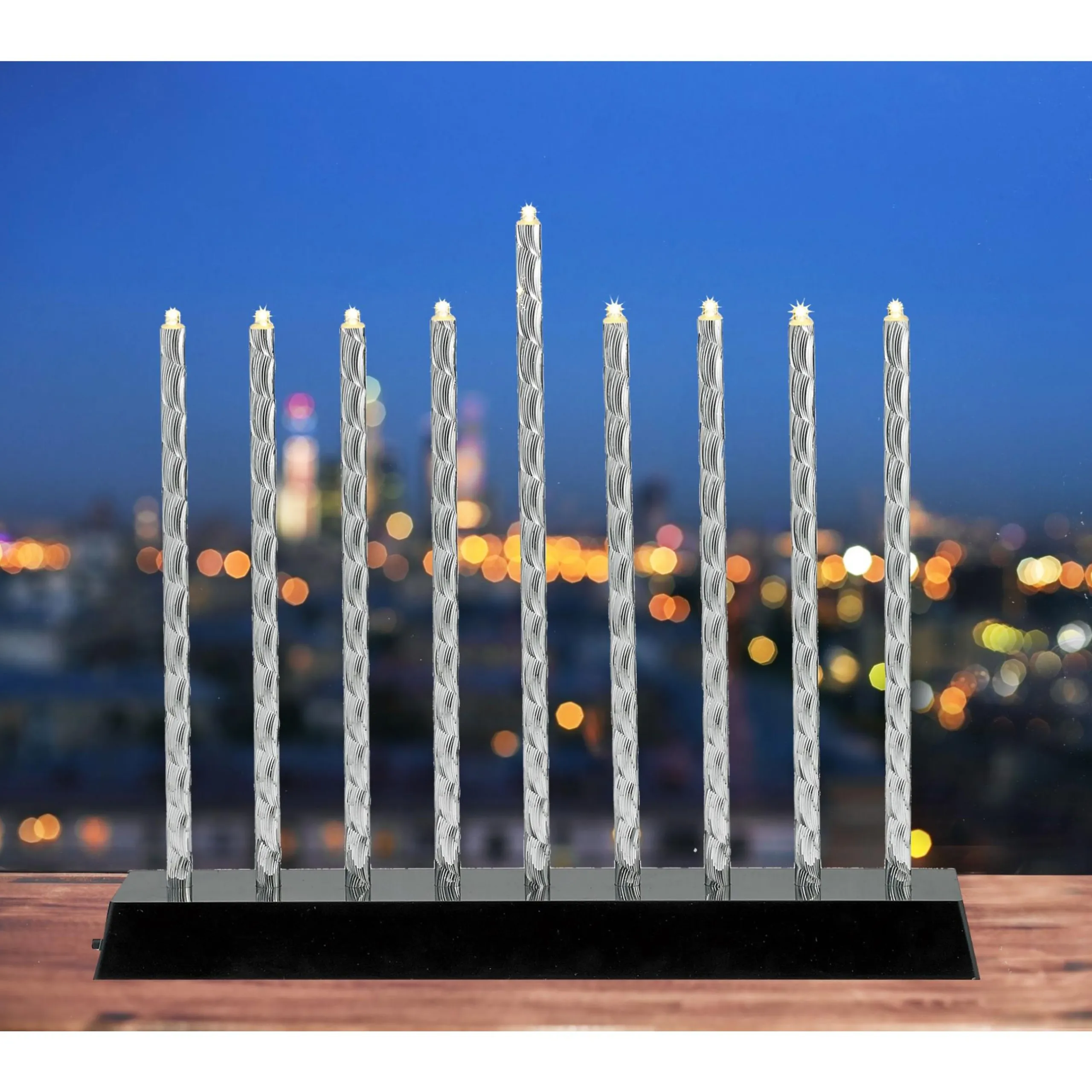 Light Up The Night With This Festive And Sparkling Silver Menorah! Mini Wide-Angle Led Lights Sit Atop The Diamond Cut Sparkling Aluminum Tubes To Enhance Your Hanukah Festivities. The Easy Push Button Feature Makes This A Must-Have This Season.