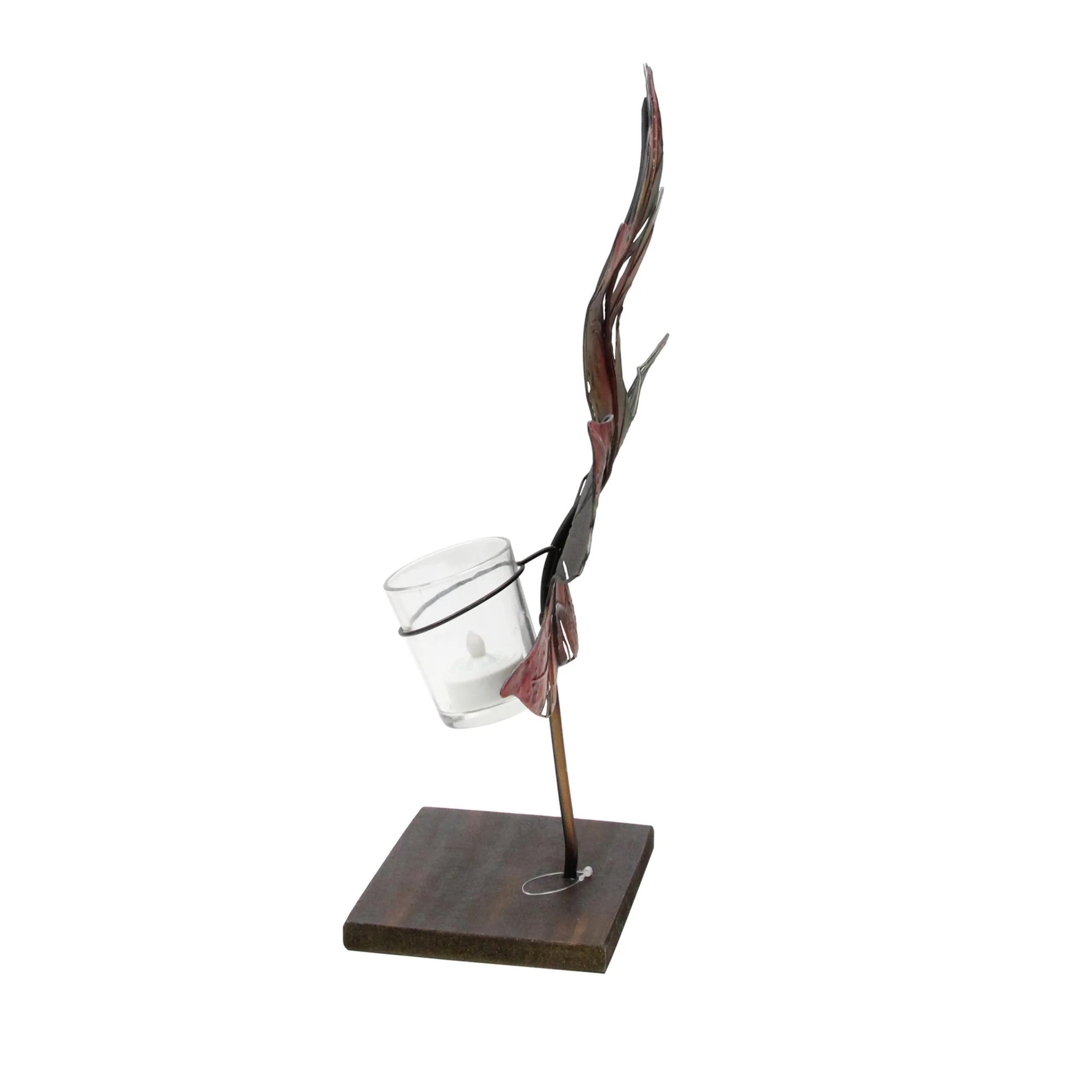 Votive Candle Holder Depicts A Multi-Colored Autumn Maple Leaf That Sits On A Wooden Inspired Stand