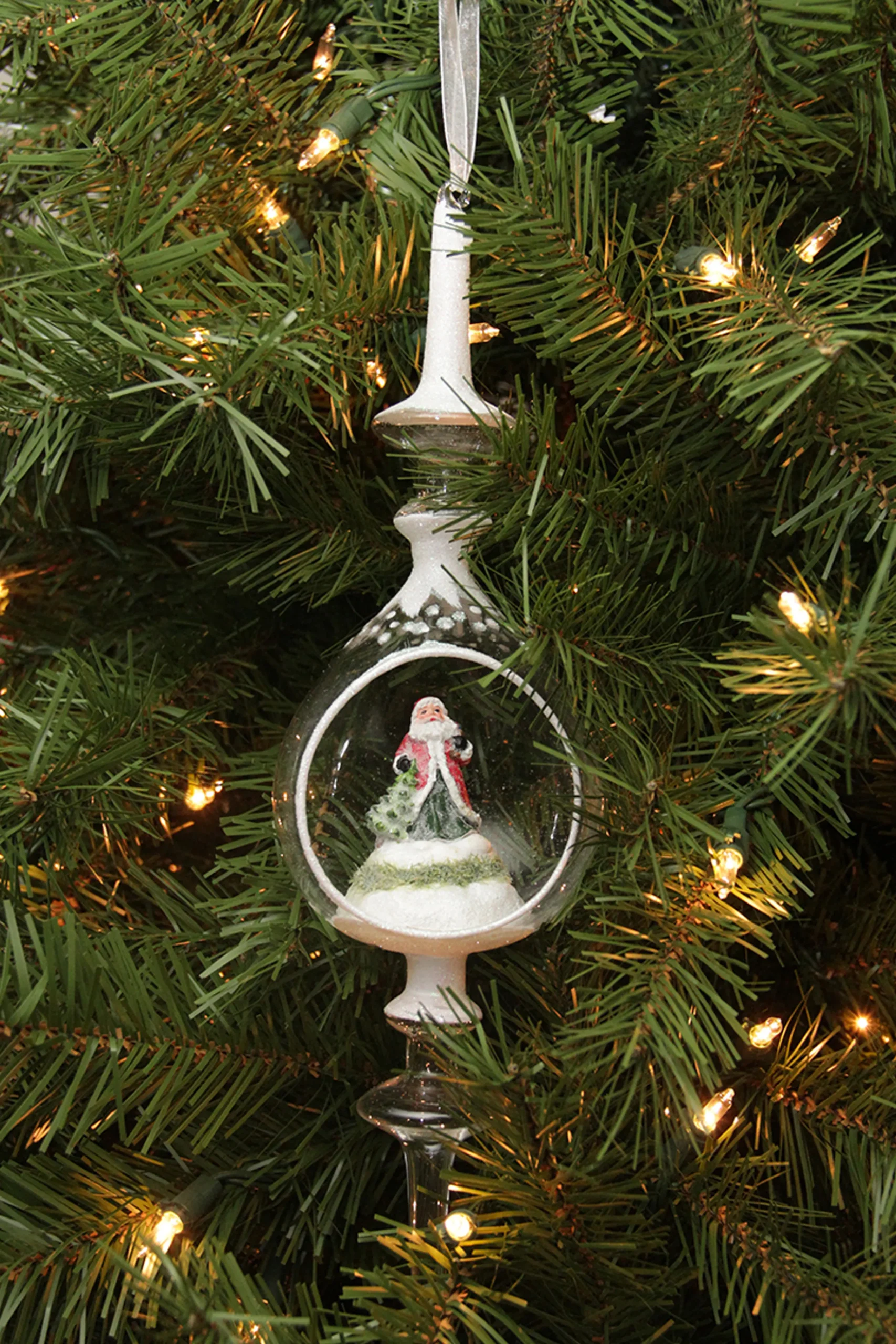 Snow-Capped Christmas Finial Features A Decorative Santa Claus Scene Inside And Is Accented With Sparkling Iridescent Glitter