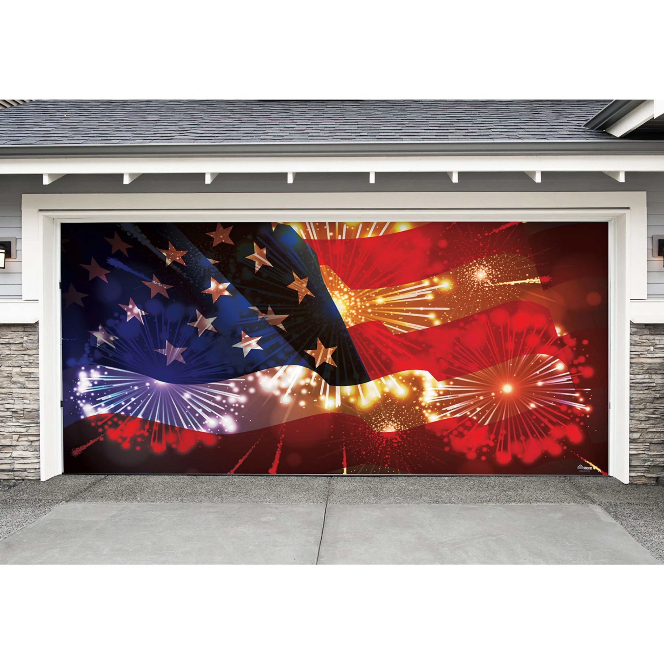 Showdown Displays 7′ X 16′ Red And Blue Outdoor American Flag With Fireworks Double Car Garage Door Banner