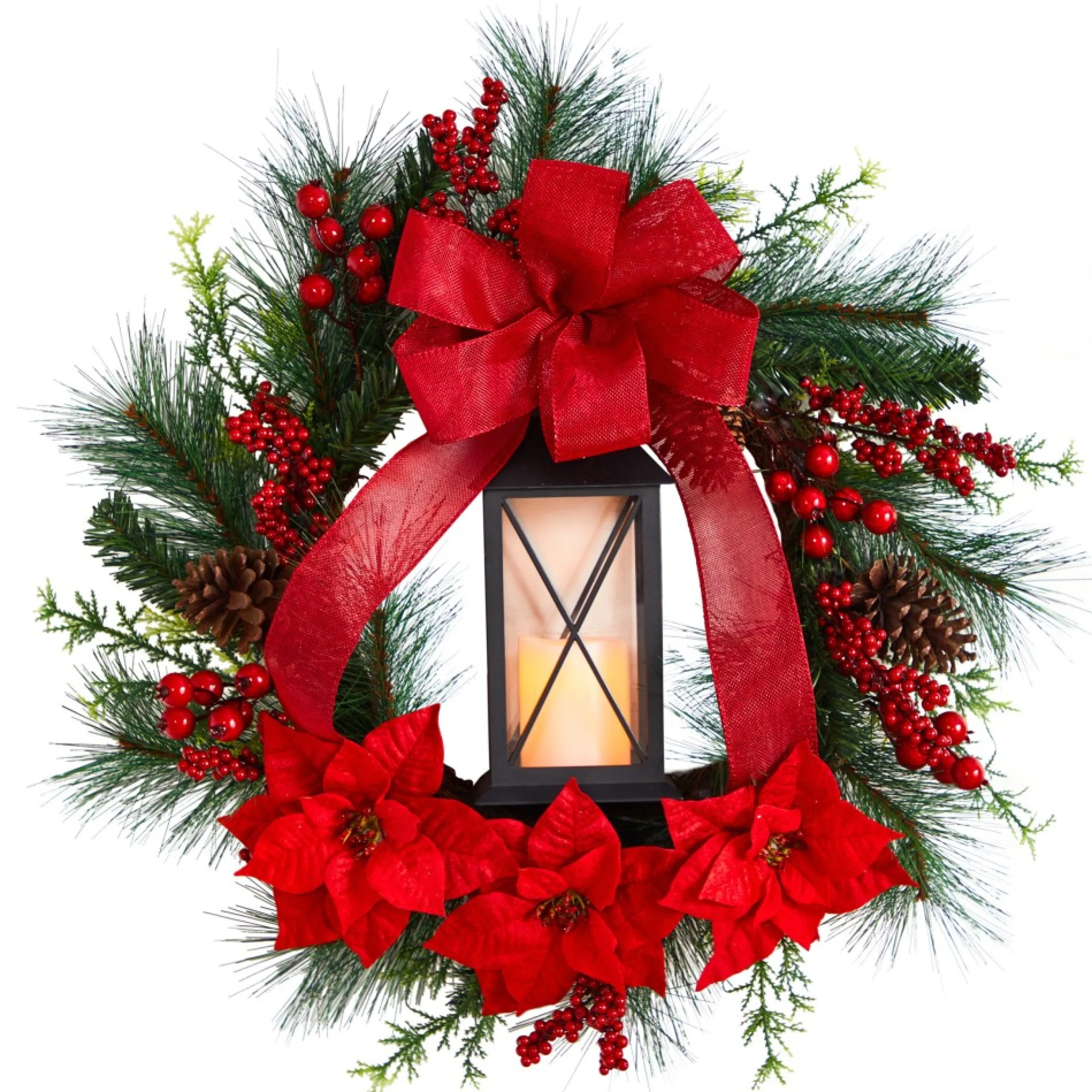 Specialty Wreaths*Nearly Natural Poinsettia And Berry Artificial Christmas Wreath With Lantern, 28-Inch