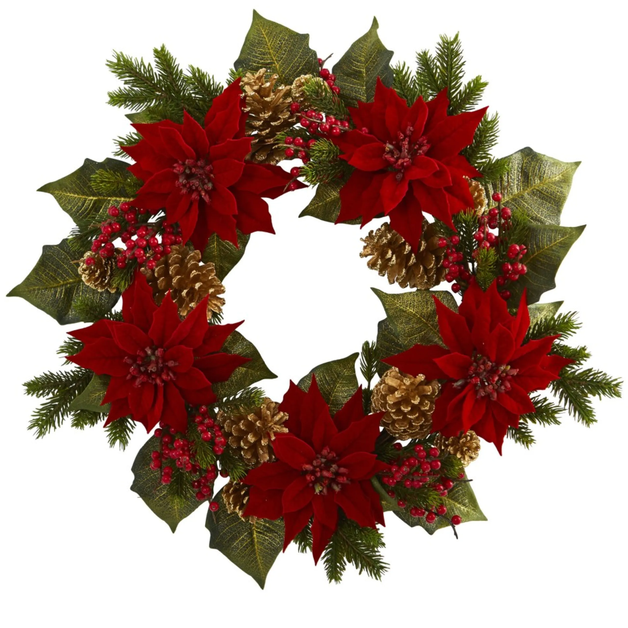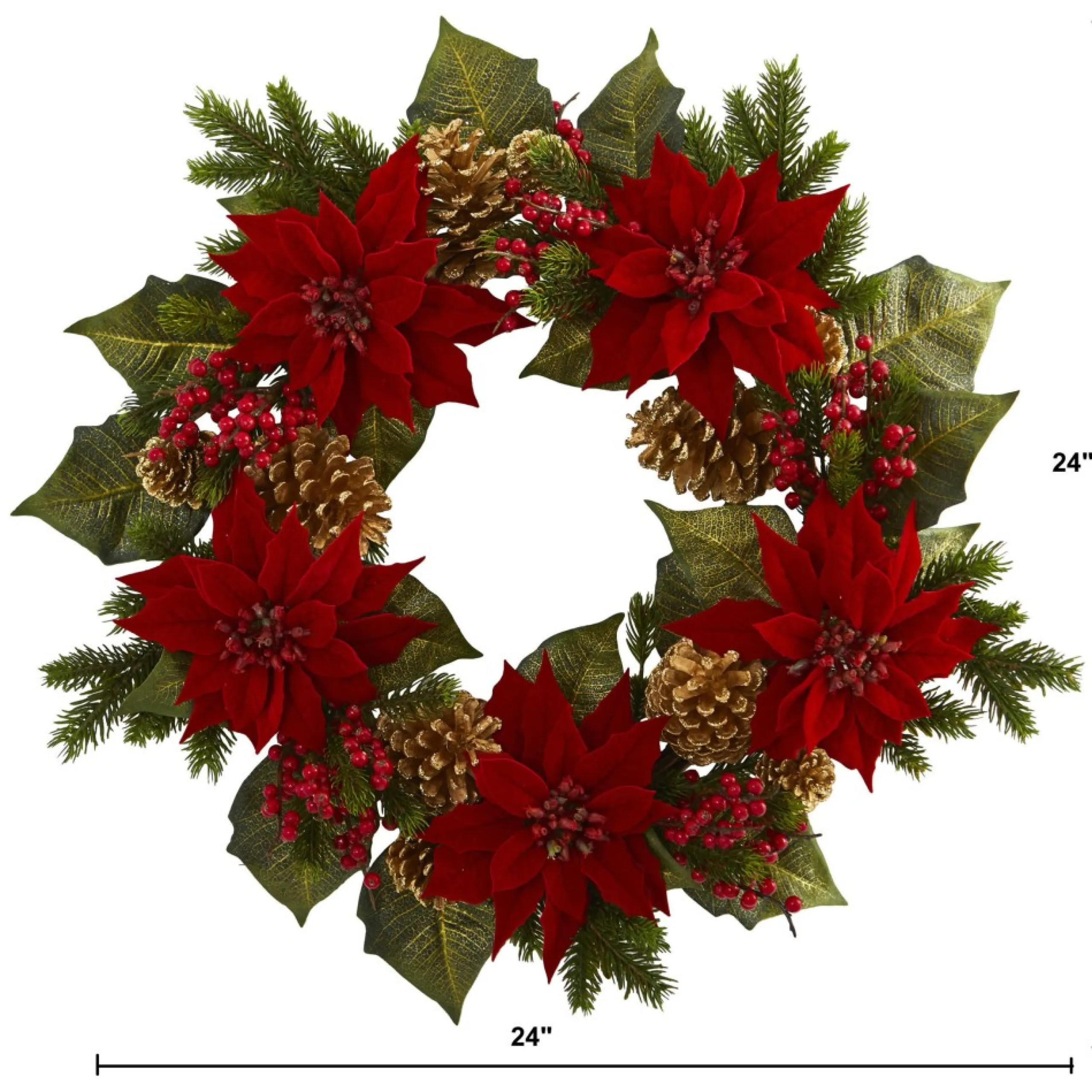 Specialty Wreaths*Nearly Natural Red Poinsettias With Berries And Pinecones Artificial Christmas Wreath, 24-Inch, Unlit