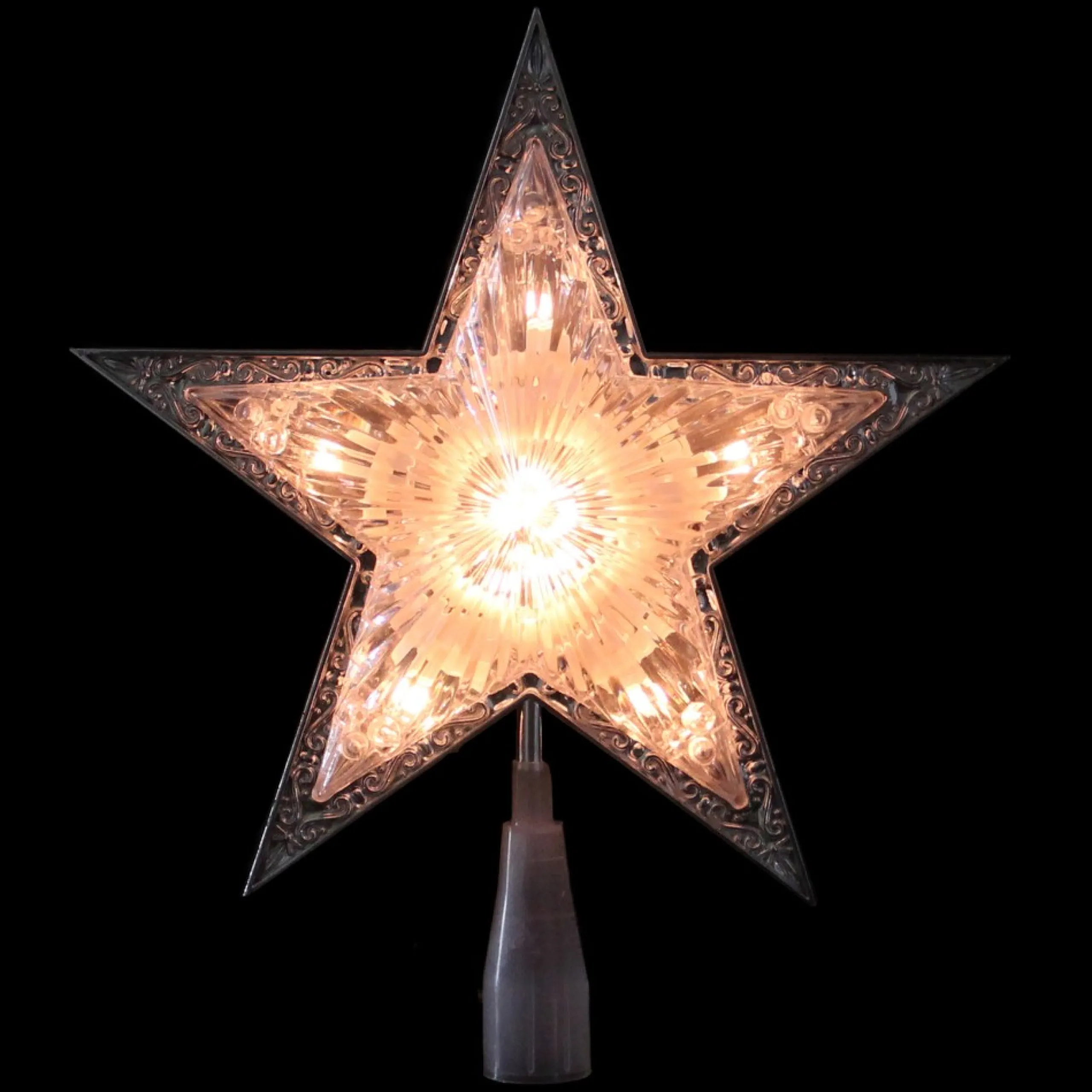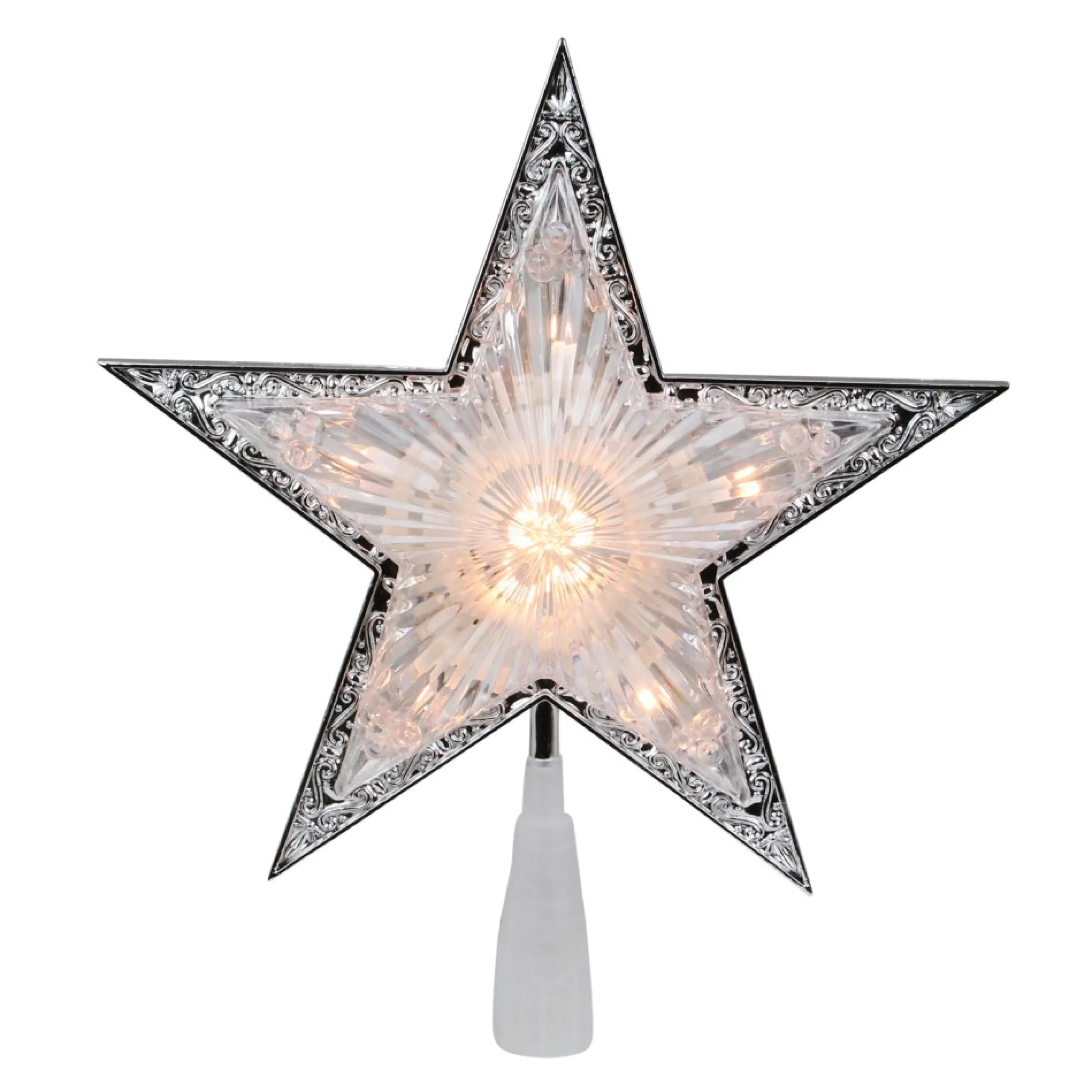 This Silver And Clear 5 Point Star Christmas Tree Topper Adds A Sparkling Touch To Any Holiday Tree. It Features A Beautiful Silver Border Pattern And A Clear Center That Allows The Lights To Twinkle Brilliantly. Perfect For Adding A Magical Finishing Touch To Your Festive Decor.