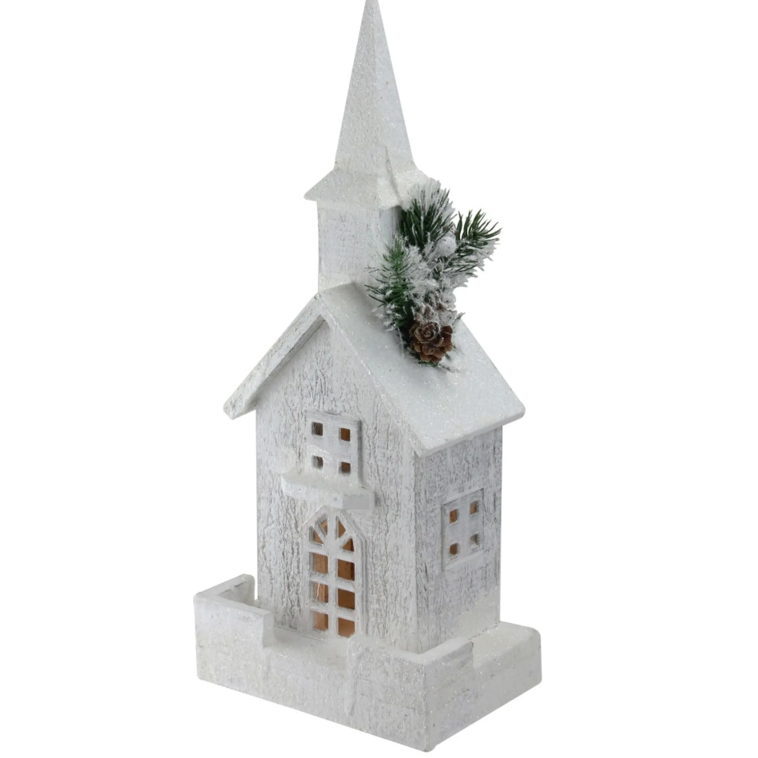 Bring That Wintry Feeling Indoors With This Classic Tabletop Decoration. This Pre-Lit White And Green Church Features Distressed Wood And It Is Lightly Dusted With Iridescent Glitter For Some Extra Sparkle. It Will Be The Perfect Addition To Your Mantle, Shelves, Or Tabletop.