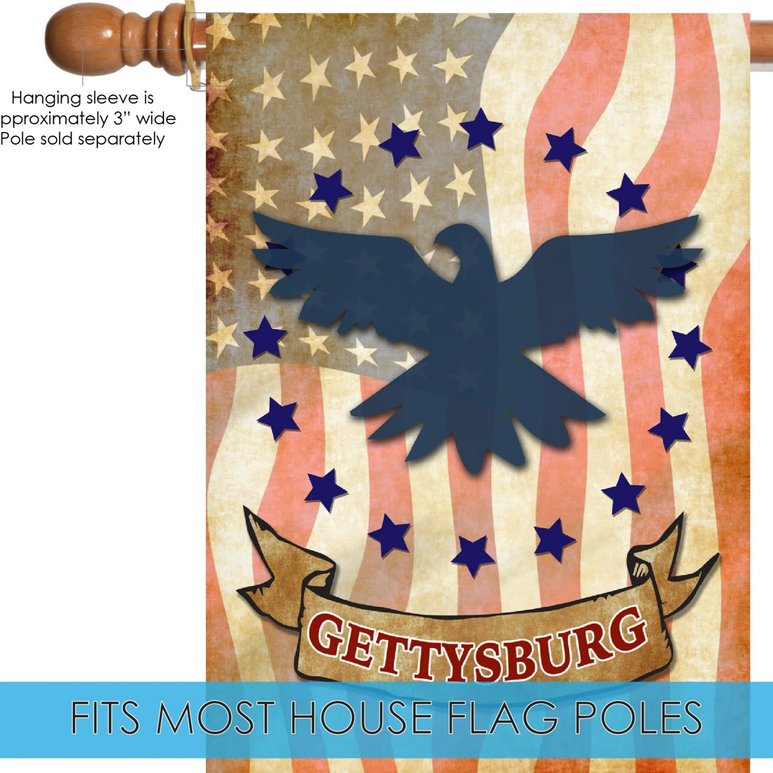 Celebrate The Spirit Of Patriotism And Honor The Historic Battle Of Gettysburg With This House Flag. This Flag Proudly Displays The Word “Gettysburg” In Bold Letters, Reminding Us Of The Significance Of This Pivotal Moment In American History. The Flag Is Adorned With A Majestic Eagle, A Symbol Of Freedom And Strength, Surrounded By Stars Against The Backdrop Of The Usa Flag. Show Your Patriotism And Honor The Legacy Of Gettysburg With This Flag.