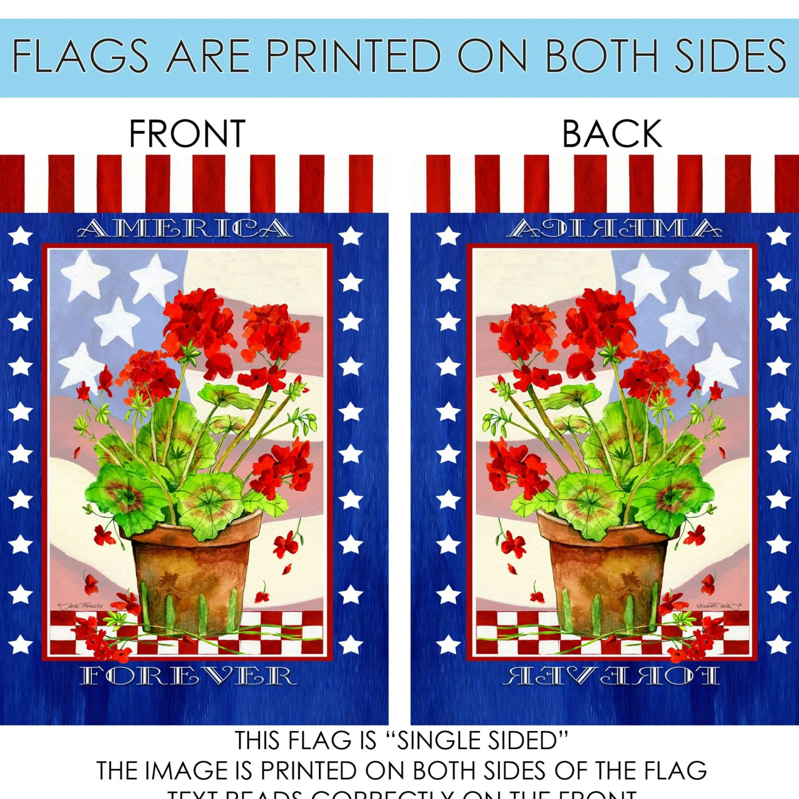 Add A Touch Of Patriotic Charm To Your Garden With This Outdoor Garden Flag. Featuring A Beautiful Red And Green Geranium Plant In A Pot With The American Flag In The Backdrop, This Mini Garden Flag Reads “America Forever” And Is Sure To Bring A Smile To Anyone’s Face. Great Gift For Any Occasion And Is An Ideal Way To Show Your Love For Your Country.
