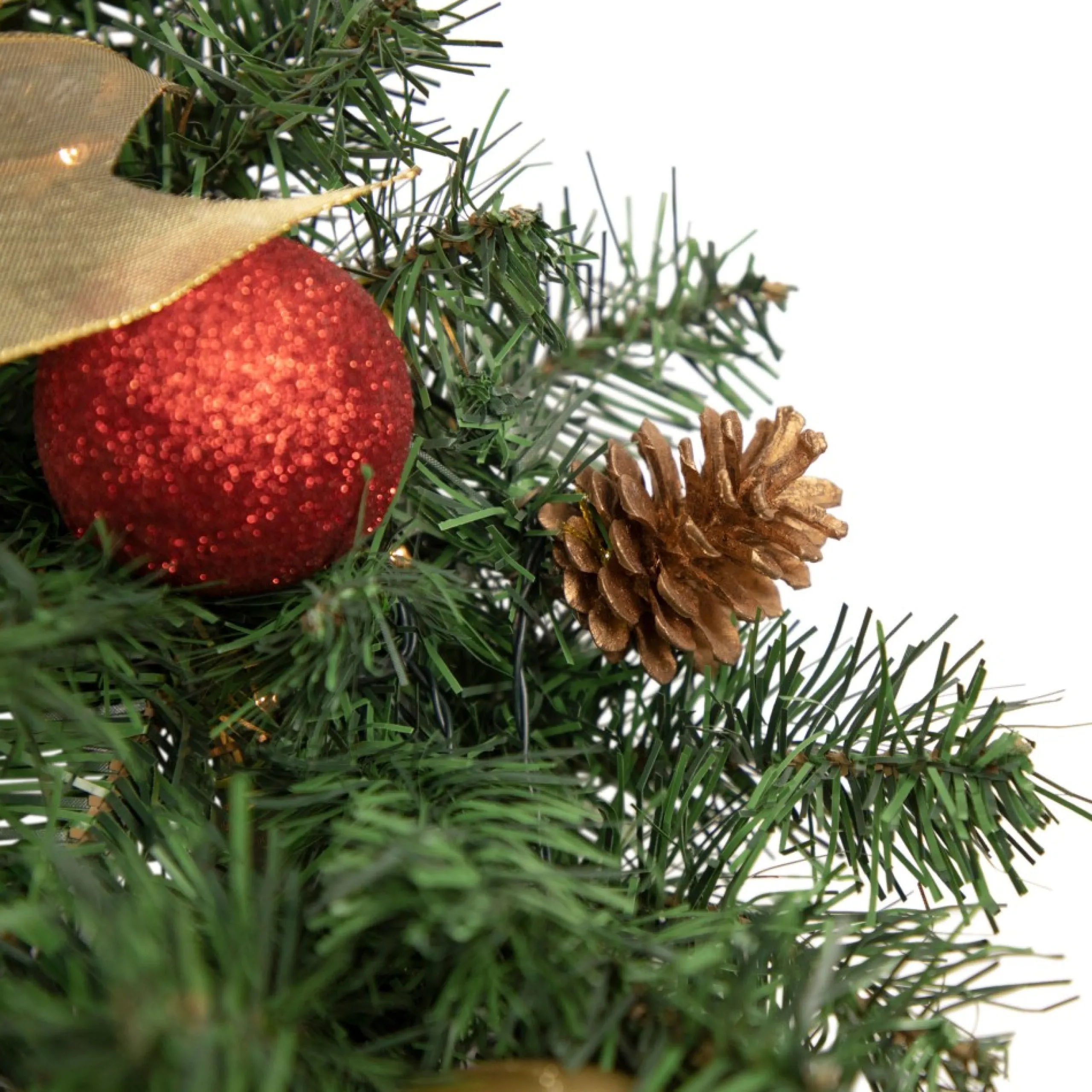 Grab This Realistic Artificial Pine Wreath Beautifully Pre-Decorated With Glitter Drenched Gift Boxes, Ball Ornaments, And Golden Pine Cones. It Is Accented By A Gold Ribbon Bow And Multi-Tone Long Needle Pine Branches Throughout For Extra Depth And Dimension. Just Perfect When You Place It By Your Christmas Tree Or Hang It Over The Doors.