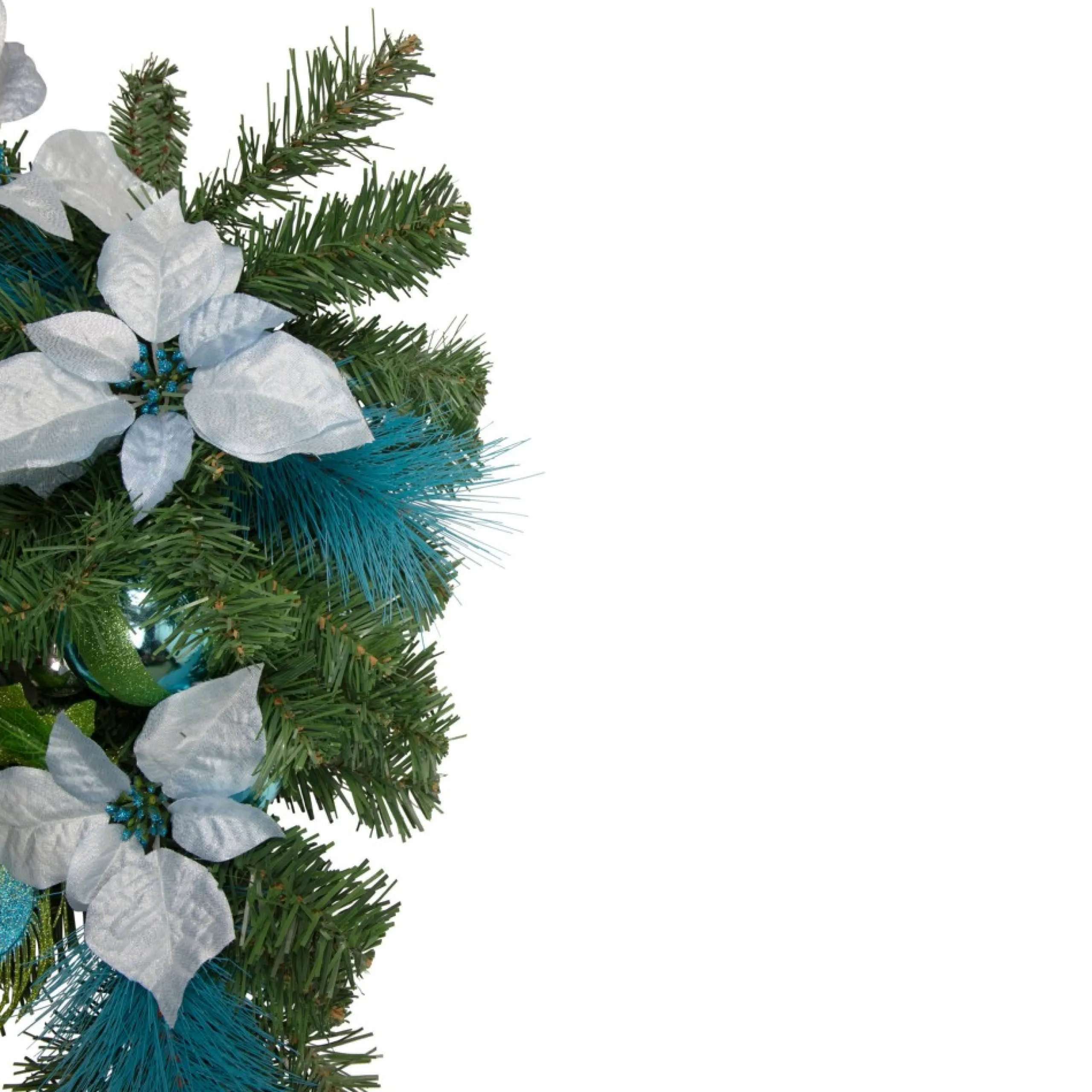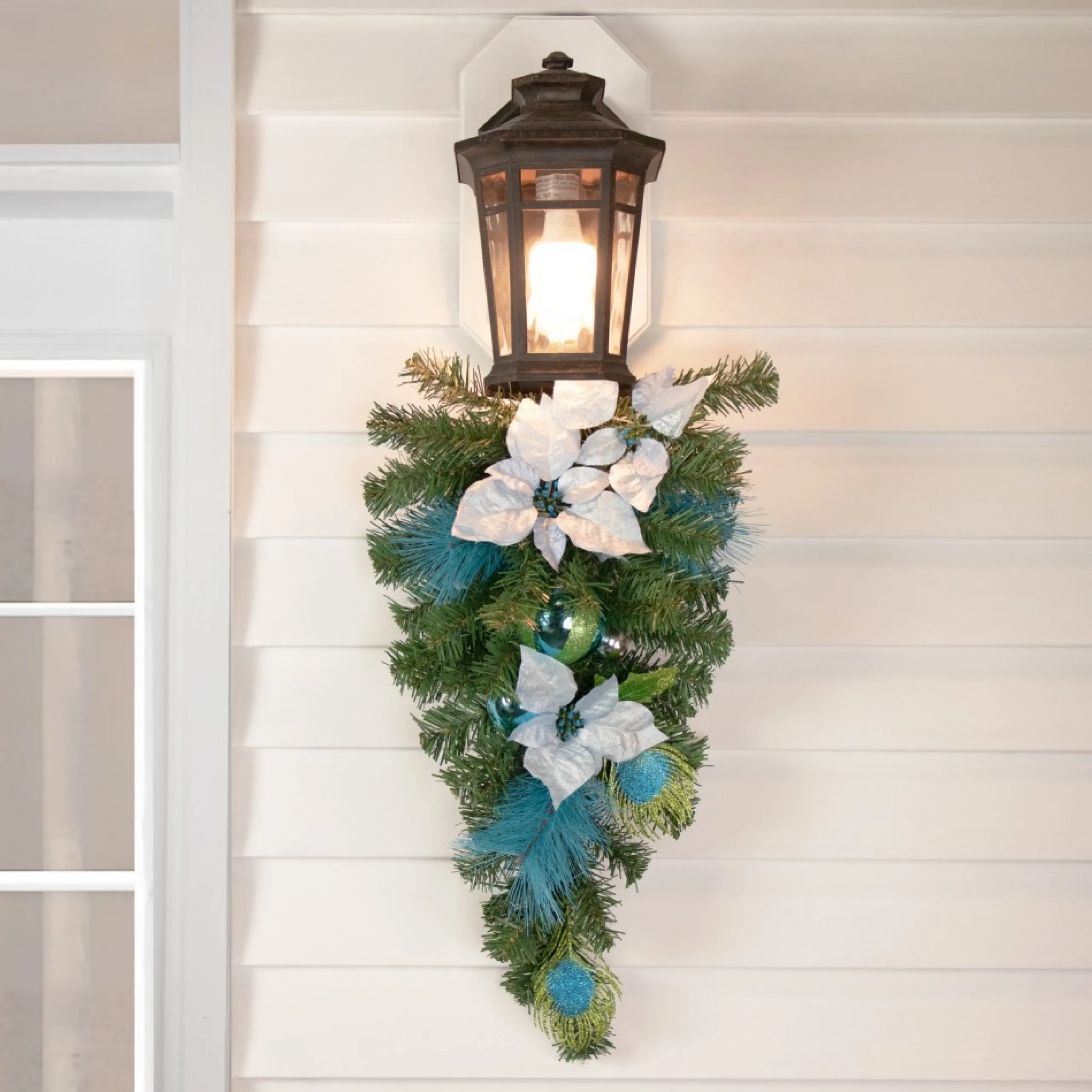 Elegant And Beautiful, Peacocks Are One Of The Most Majestic Birds On Earth. Add Some Of That Beauty And Elegance To Your Christmas Decor With This Pre-Decorated Teardrop Swag. It Is Accented With Blue And Silver Ornament Balls, Glittered Blue Poinsettias, And Blue And Green Peacock Feathers. Perfect For Hanging On Doors, Over Thresholds, Or Add Candles And Create A Unique Table Decoration