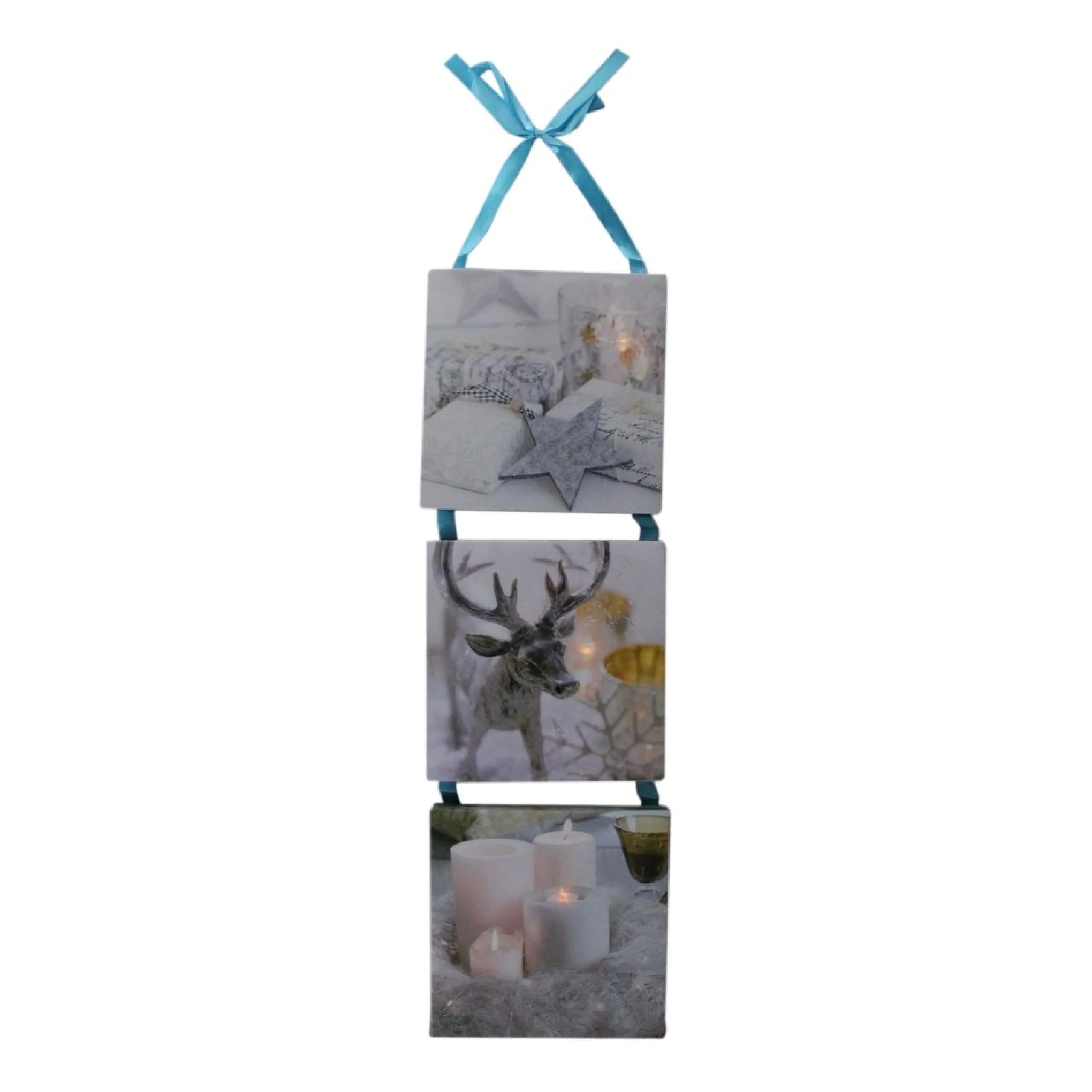 Features 3 Canvas Panels With Printed Pictures Of Wrapped Presents, A Deer Decoration And 4 Candles; Each Panel Has A Lighted Candle Flame